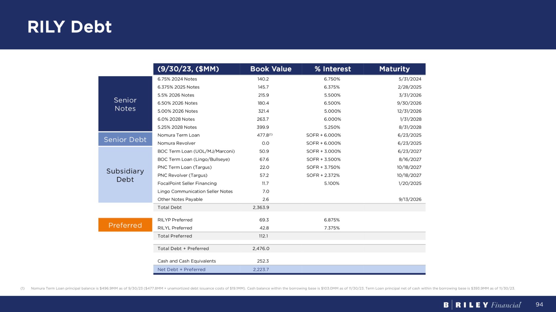 Maturity % I n t e r e st Book Value (9/30/23, ($MM) 5/31/2024 6.750% 140.2 6.75% 2024 Notes S e n i or Notes 2/28/2025 6.375% 145.7 6.375% 2025 Notes 3/31/2026 5.500% 215.9 5.5% 2026 Notes 9/30/2026 6.500% 180.4 6.50% 2026 Notes 12/31/2026 5.000% 321.4 5.00% 2026 Notes 1/31/2028 6.000% 263.7 6.0% 2028 Notes 8/31/2028 5.250% 399.9 5.25% 2028 Notes 6/23/2025 SOFR + 6.000% 477.8 (1) Nomura Term Loan Senior Debt 6/23/2025 SOFR + 6.000% 0.0 Nomu r a R e vo l v e r 6/23/2027 SOFR + 3.000% 50.9 BOC Term Loan (UOL/MJ/Marconi) S u b s idi a r y Debt 8/16/2027 SOFR + 3.500% 67.6 BOC Term Loan (Lingo/Bullseye) 10/18/2027 SOFR + 3.750% 22.0 PNC Term Loan (Targus) 10/18/2027 SOFR + 2.372% 57.2 PNC Revolver (Targus) 1/20/2025 5.100% 11.7 FocalPoint Seller Financing 7.0 Lingo Communication Seller Notes 9/13/2026 2.6 Other Notes Payable 2,363.9 Total Debt 6.875% 69.3 RILYP Preferred Preferred 7.375% 42.8 RILYL Preferred 112.1 Total Preferred 2,476.0 Total Debt + Preferred 252.3 Cash and Cash Equivalents 2,223.7 Net Debt + Preferred (1) Nomura Term Loan principal balance is $496.9MM as of 9/30/23 ($477.8MM + unamortized debt issuance costs of $19.1MM). Cash balance within the borrowing base is $103.0MM as of 11/30/23. Term Loan principal net of cash within the borrowing base is $393.9MM as of 11/30/23. RILY Debt 94