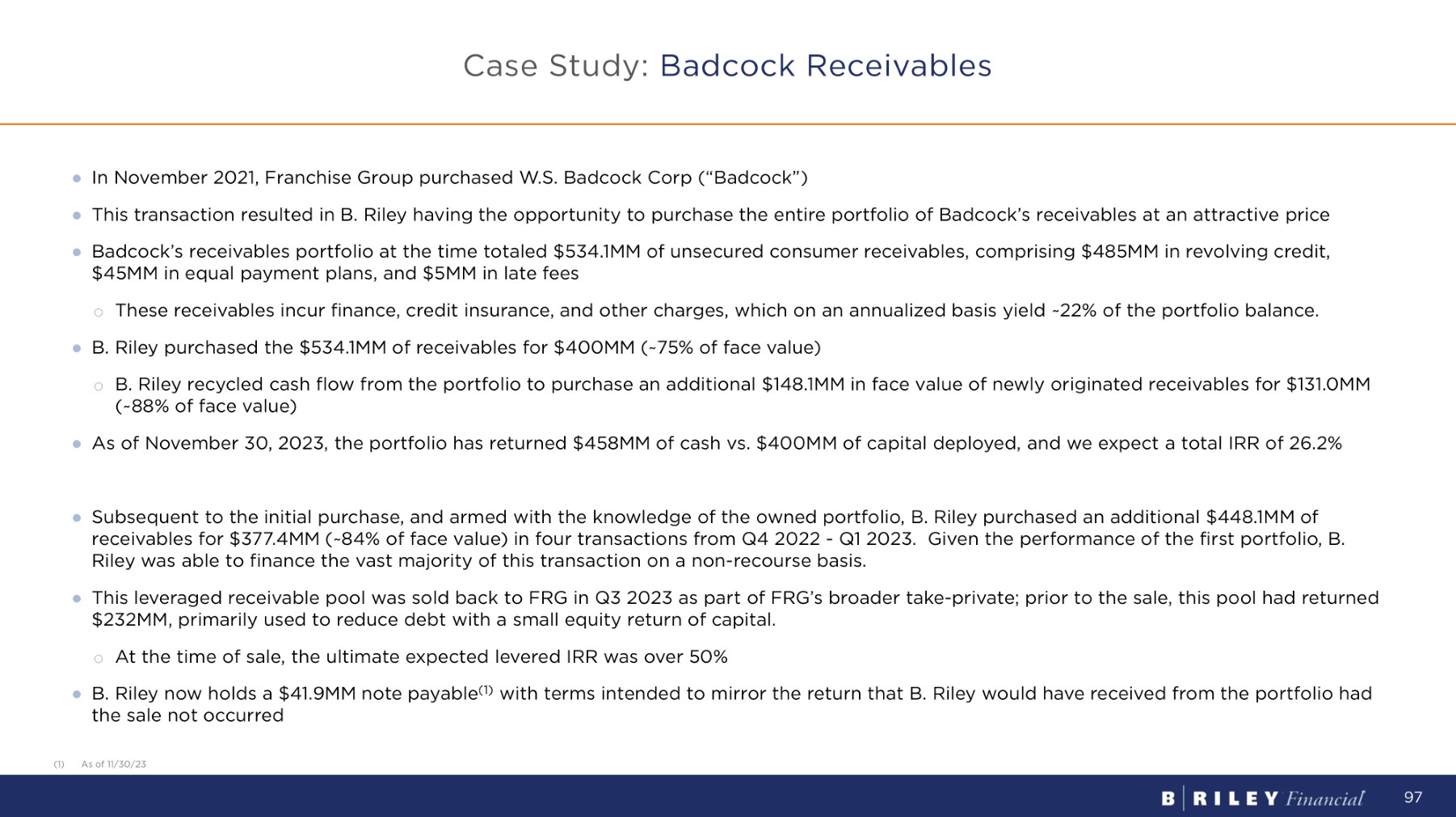 ● In November 2021, Franchise Group purchased W.S. Badcock Corp (“Badcock”) ● This transaction resulted in B. Riley having the opportunity to purchase the entire portfolio of Badcock’s receivables at an attractive price ● Badcock’s receivables portfolio at the time totaled $534.1MM of unsecured consumer receivables, comprising $485MM in revolving credit, $45MM in equal payment plans, and $5MM in late fees o These receivables incur finance, credit insurance, and other charges, which on an annualized basis yield ~22% of the portfolio balance. ● B. Riley purchased the $534.1MM of receivables for $400MM (~75% of face value) o B. Riley recycled cash flow from the portfolio to purchase an additional $148.1MM in face value of newly originated receivables for $131.0MM (~88% of face value) ● As of November 30, 2023, the portfolio has returned $458MM of cash vs. $400MM of capital deployed, and we expect a total IRR of 26.2% ● Subsequent to the initial purchase, and armed with the knowledge of the owned portfolio, B. Riley purchased an additional $448.1MM of receivables for $377.4MM (~84% of face value) in four transactions from Q4 2022 - Q1 2023. Given the performance of the first portfolio, B. Riley was able to finance the vast majority of this transaction on a non - recourse basis. ● This leveraged receivable pool was sold back to FRG in Q3 2023 as part of FRG’s broader take - private; prior to the sale, this pool had returned $232MM, primarily used to reduce debt with a small equity return of capital. o At the time of sale, the ultimate expected levered IRR was over 50% ● B. Riley now holds a $41.9MM note payable (1) with terms intended to mirror the return that B. Riley would have received from the portfolio had the sale not occurred (1) As of 11/30/23 Case Study: Badcock Receivables 97