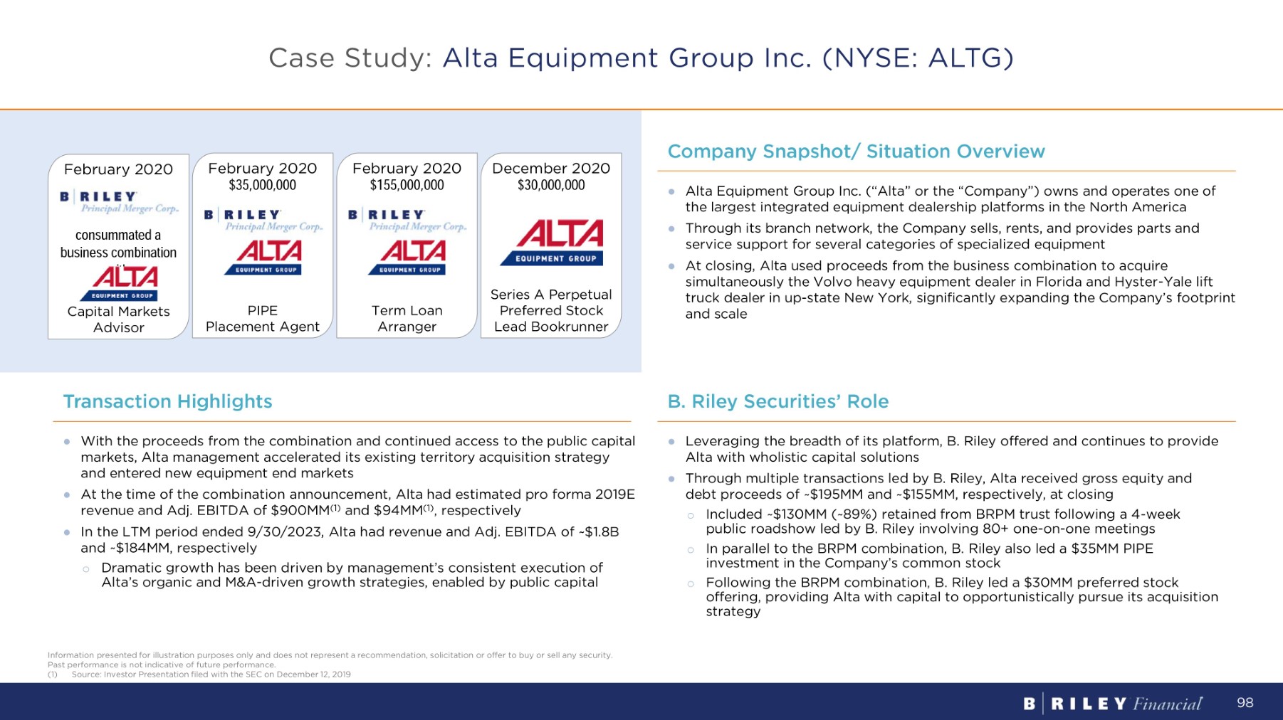 ● Alta Equipment Group Inc. (“Alta” or the “Company”) owns and operates one of the largest integrated equipment dealership platforms in the North America ● Through its branch network, the Company sells, rents, and provides parts and service support for several categories of specialized equipment ● At closing, Alta used proceeds from the business combination to acquire simultaneously the Volvo heavy equipment dealer in Florida and Hyster - Yale lift truck dealer in up - state New York, significantly expanding the Company’s footprint and scale Company Snapshot/ Situation Overview Transaction Highlights ● With the proceeds from the combination and continued access to the public capital markets, Alta management accelerated its existing territory acquisition strategy and entered new equipment end markets ● At the time of the combination announcement, Alta had estimated pro forma 2019E revenue and Adj. EBITDA of $900MM (1) and $94MM (1) , respectively ● In the LTM period ended 9/30/2023, Alta had revenue and Adj. EBITDA of ~$1.8B and ~$184MM, respectively o Dramatic growth has been driven by management’s consistent execution of Alta’s organic and M&A - driven growth strategies, enabled by public capital ● Leveraging the breadth of its platform, B. Riley offered and continues to provide Alta with wholistic capital solutions ● Through multiple transactions led by B. Riley, Alta received gross equity and debt proceeds of ~$195MM and ~$155MM, respectively, at closing o Included ~$130MM (~89%) retained from BRPM trust following a 4 - week public roadshow led by B. Riley involving 80+ one - on - one meetings o In parallel to the BRPM combination, B. Riley also led a $35MM PIPE investment in the Company’s common stock o Following the BRPM combination, B. Riley led a $30MM preferred stock offering, providing Alta with capital to opportunistically pursue its acquisition strategy B . R il e y S e c u r i t i e s ’ R o le February 2020 $155,000,000 Term Loan Arranger February 2020 Capital Markets Advisor February 2020 $35,000,000 PIPE Placement Agent December 2020 $30,000,000 Series A Perpetual Preferred Stock Lead Bookrunner consumma t ed a bus i ness comb i na ti on w i t h Information presented for illustration purposes only and does not represent a recommendation, solicitation or offer to buy or sell any security. Past performance is not indicative of future performance. (1) Source: Investor Presentation filed with the SEC on December 12, 2019 98 Case Study: Alta Equipment Group Inc. (NYSE: ALTG)