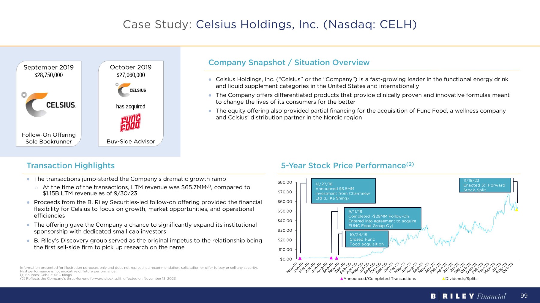 ● Celsius Holdings, Inc. (“Celsius” or the “Company”) is a fast - growing leader in the functional energy drink and liquid supplement categories in the United States and internationally ● The Company offers differentiated products that provide clinically proven and innovative formulas meant to change the lives of its consumers for the better ● The equity offering also provided partial financing for the acquisition of Func Food, a wellness company and Celsius’ distribution partner in the Nordic region Company Snapshot / Situation Overview Transaction Highlights ● The transactions jump - started the Company’s dramatic growth ramp o At the time of the transactions, LTM revenue was $65.7MM (1) , compared to $1.15B LTM revenue as of 9/30/23 ● Proceeds from the B. Riley Securities - led follow - on offering provided the financial flexibility for Celsius to focus on growth, market opportunities, and operational efficiencies ● The offering gave the Company a chance to significantly expand its institutional sponsorship with dedicated small cap investors ● B. Riley’s Discovery group served as the original impetus to the relationship being the first sell - side firm to pick up research on the name 5 - Y ear S t oc k P r i c e P e r f o r m a n c e ( 2) September 2019 $28,750,000 Follow - On Offering Sole Bookrunner October 2019 $27,060,000 Buy - Side Advisor has acqu i r ed Information presented for illustration purposes only and does not represent a recommendation, solicitation or offer to buy or sell any security. Past performance is not indicative of future performance. (1) Sources: Celsius’ SEC filings (2) Reflects the Company’s three - for - one forward stock split, effected on November 13, 2023 $ 0 . 00 $ 1 0 . 00 $ 2 0 . 00 $ 3 0 . 00 $ 4 0 . 00 $50 . 00 $ 6 0 . 00 $ 7 0 . 00 $80.00 Announced/Completed Transactions Dividends/Splits 99 12/27/18 Announced $6.5MM investment from Charmnew Ltd (Li Ka Shing) 10/24/19 Closed Func Food acquisition 9/11/19 Completed ~$29MM Follow - On Entered into agreement to acquire FUNC Food Group Oyj 11/15/23 Enacted 3:1 Forward Stock - Split Case Study: Celsius Holdings, Inc. (Nasdaq: CELH)