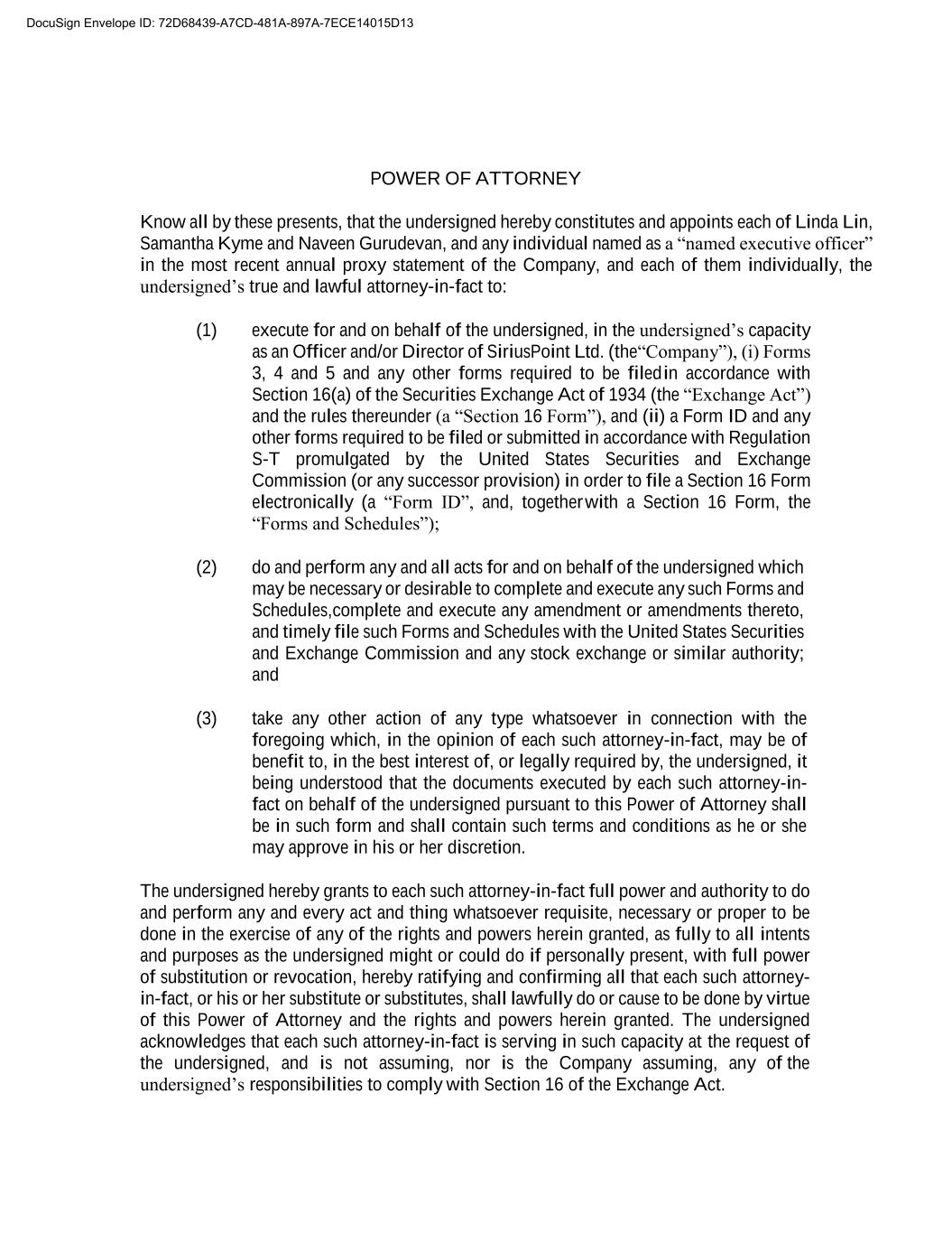 POWER OF ATTORNEY Know all by these presents, that the undersigned hereby constitutes and appoints each of Linda Lin, Samantha Kyme and Naveen Gurudevan, and any individual named as a “named executive officer” in the most recent annual proxy statement of the Company, and each of them individually, the undersigned’s true and lawful attorney-in-fact to: (1) execute for and on behalf of the undersigned, in the undersigned’s capacity as an Officer and/or Director of SiriusPoint Ltd. (the “Company”), (i) Forms 3, 4 and 5 and any other forms required to be filed in accordance with Section 16(a) of the Securities Exchange Act of 1934 (the “Exchange Act”) and the rules thereunder (a “Section 16 Form”), and (ii) a Form ID and any other forms required to be filed or submitted in accordance with Regulation S-T promulgated by the United States Securities and Exchange Commission (or any successor provision) in order to file a Section 16 Form electronically (a “Form ID”, and, together with a Section 16 Form, the “Forms and Schedules”); (2) do and perform any and all acts for and on behalf of the undersigned which may be necessary or desirable to complete and execute any such Forms and Schedules, complete and execute any amendment or amendments thereto, and timely file such Forms and Schedules with the United States Securities and Exchange Commission and any stock exchange or similar authority; and (3) take any other action of any type whatsoever in connection with the foregoing which, in the opinion of each such attorney-in-fact, may be of benefit to, in the best interest of, or legally required by, the undersigned, it being understood that the documents executed by each such attorney-in- fact on behalf of the undersigned pursuant to this Power of Attorney shall be in such form and shall contain such terms and conditions as he or she may approve in his or her discretion. The undersigned hereby grants to each such attorney-in-fact full power and authority to do and perform any and every act and thing whatsoever requisite, necessary or proper to be done in the exercise of any of the rights and powers herein granted, as fully to all intents and purposes as the undersigned might or could do if personally present, with full power of substitution or revocation, hereby ratifying and confirming all that each such attorney- in-fact, or his or her substitute or substitutes, shall lawfully do or cause to be done by virtue of this Power of Attorney and the rights and powers herein granted. The undersigned acknowledges that each such attorney-in-fact is serving in such capacity at the request of the undersigned, and is not assuming, nor is the Company assuming, any of the undersigned’s responsibilities to comply with Section 16 of the Exchange Act. DocuSign Envelope ID: 72D68439-A7CD-481A-897A-7ECE14015D13