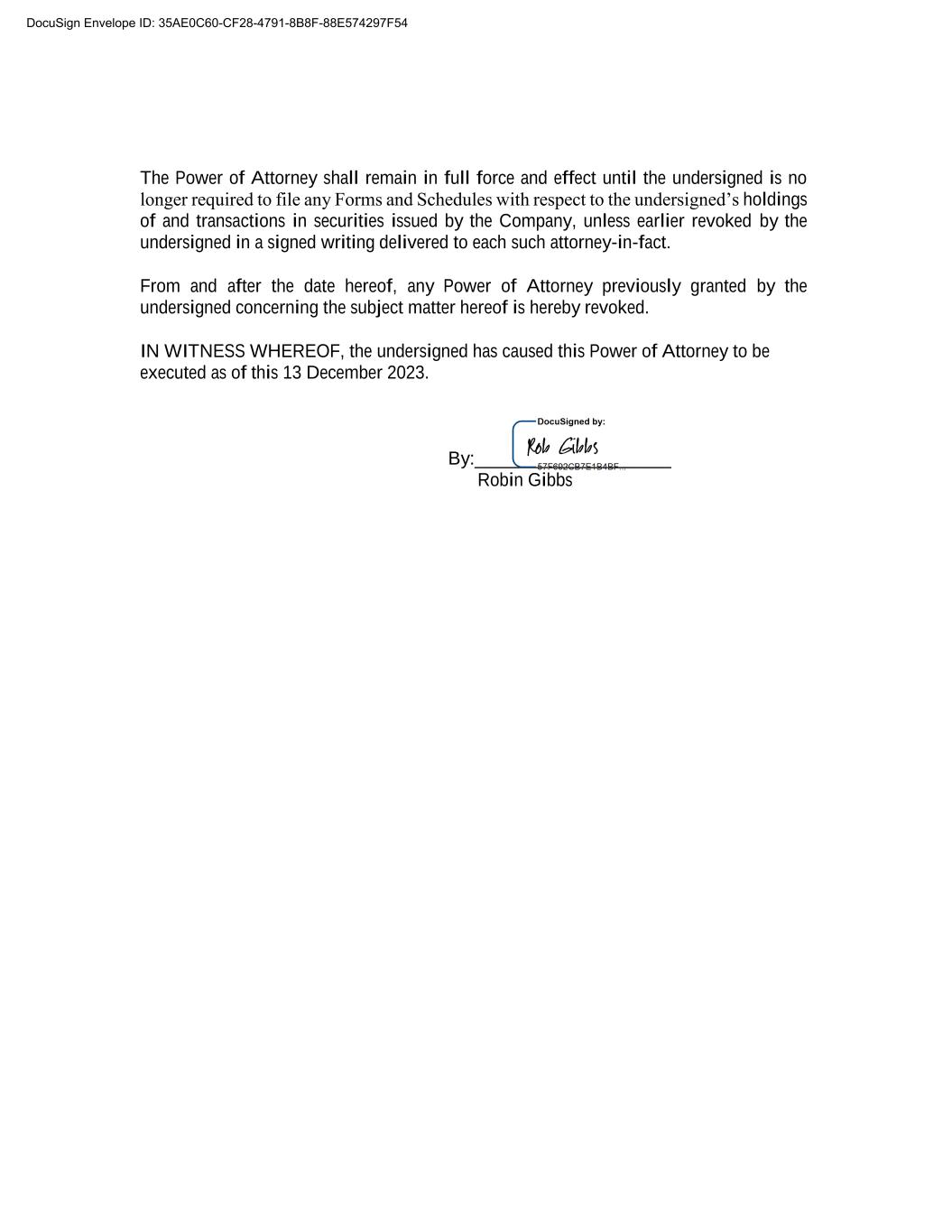 The Power of Attorney shall remain in full force and effect until the undersigned is no longer required to file any Forms and Schedules with respect to the undersigned’s holdings of and transactions in securities issued by the Company, unless earlier revoked by the undersigned in a signed writing delivered to each such attorney-in-fact. From and after the date hereof, any Power of Attorney previously granted by the undersigned concerning the subject matter hereof is hereby revoked. IN WITNESS WHEREOF, the undersigned has caused this Power of Attorney to be executed as of this 13 December 2023. By:_____________________ Robin Gibbs DocuSign Envelope ID: 35AE0C60-CF28-4791-8B8F-88E574297F54