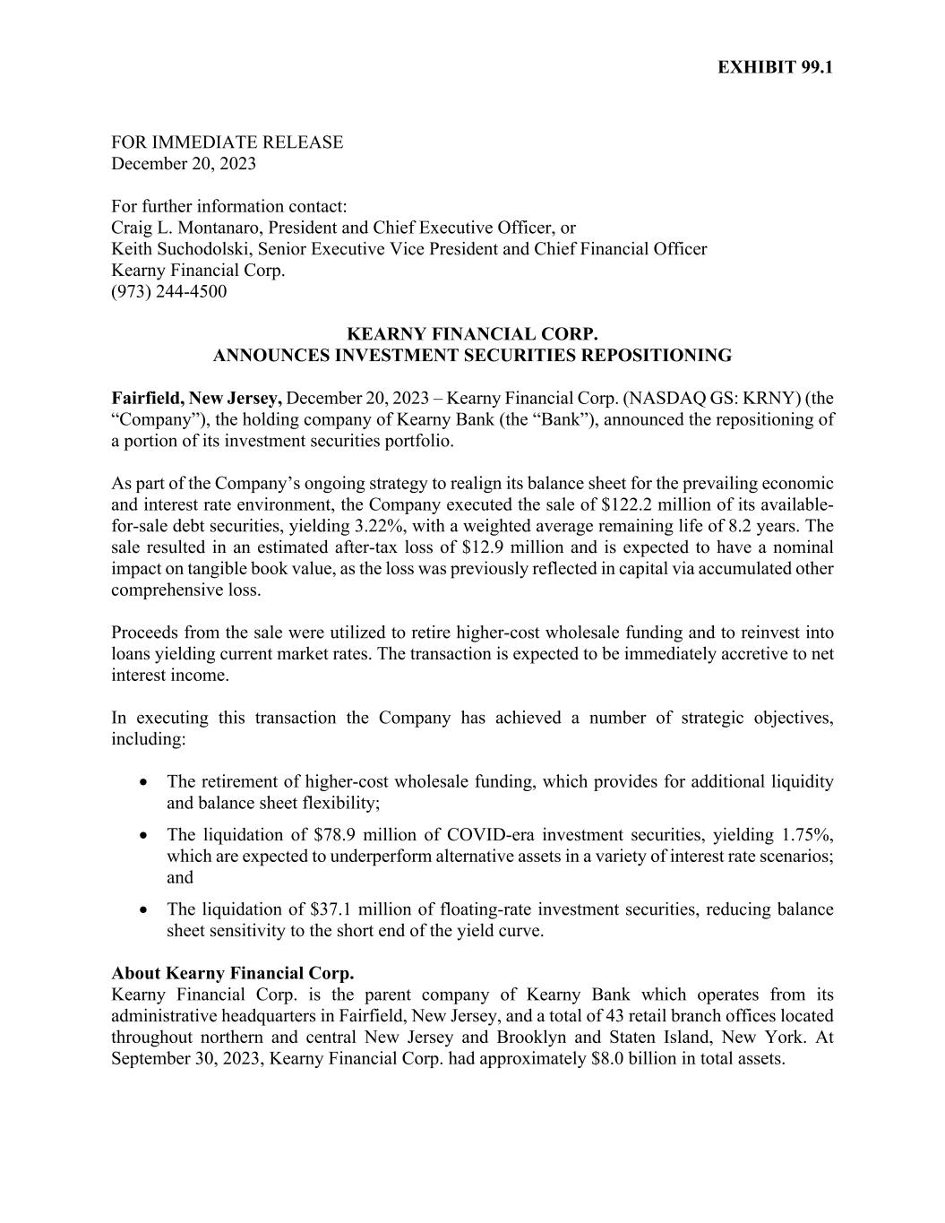 EXHIBIT 99.1 FOR IMMEDIATE RELEASE December 20, 2023 For further information contact: Craig L. Montanaro, President and Chief Executive Officer, or Keith Suchodolski, Senior Executive Vice President and Chief Financial Officer Kearny Financial Corp. (973) 244-4500 KEARNY FINANCIAL CORP. ANNOUNCES INVESTMENT SECURITIES REPOSITIONING Fairfield, New Jersey, December 20, 2023 – Kearny Financial Corp. (NASDAQ GS: KRNY) (the “Company”), the holding company of Kearny Bank (the “Bank”), announced the repositioning of a portion of its investment securities portfolio. As part of the Company’s ongoing strategy to realign its balance sheet for the prevailing economic and interest rate environment, the Company executed the sale of $122.2 million of its available- for-sale debt securities, yielding 3.22%, with a weighted average remaining life of 8.2 years. The sale resulted in an estimated after-tax loss of $12.9 million and is expected to have a nominal impact on tangible book value, as the loss was previously reflected in capital via accumulated other comprehensive loss. Proceeds from the sale were utilized to retire higher-cost wholesale funding and to reinvest into loans yielding current market rates. The transaction is expected to be immediately accretive to net interest income. In executing this transaction the Company has achieved a number of strategic objectives, including: The retirement of higher-cost wholesale funding, which provides for additional liquidity and balance sheet flexibility; The liquidation of $78.9 million of COVID-era investment securities, yielding 1.75%, which are expected to underperform alternative assets in a variety of interest rate scenarios; and The liquidation of $37.1 million of floating-rate investment securities, reducing balance sheet sensitivity to the short end of the yield curve. About Kearny Financial Corp. Kearny Financial Corp. is the parent company of Kearny Bank which operates from its administrative headquarters in Fairfield, New Jersey, and a total of 43 retail branch offices located throughout northern and central New Jersey and Brooklyn and Staten Island, New York. At September 30, 2023, Kearny Financial Corp. had approximately $8.0 billion in total assets.