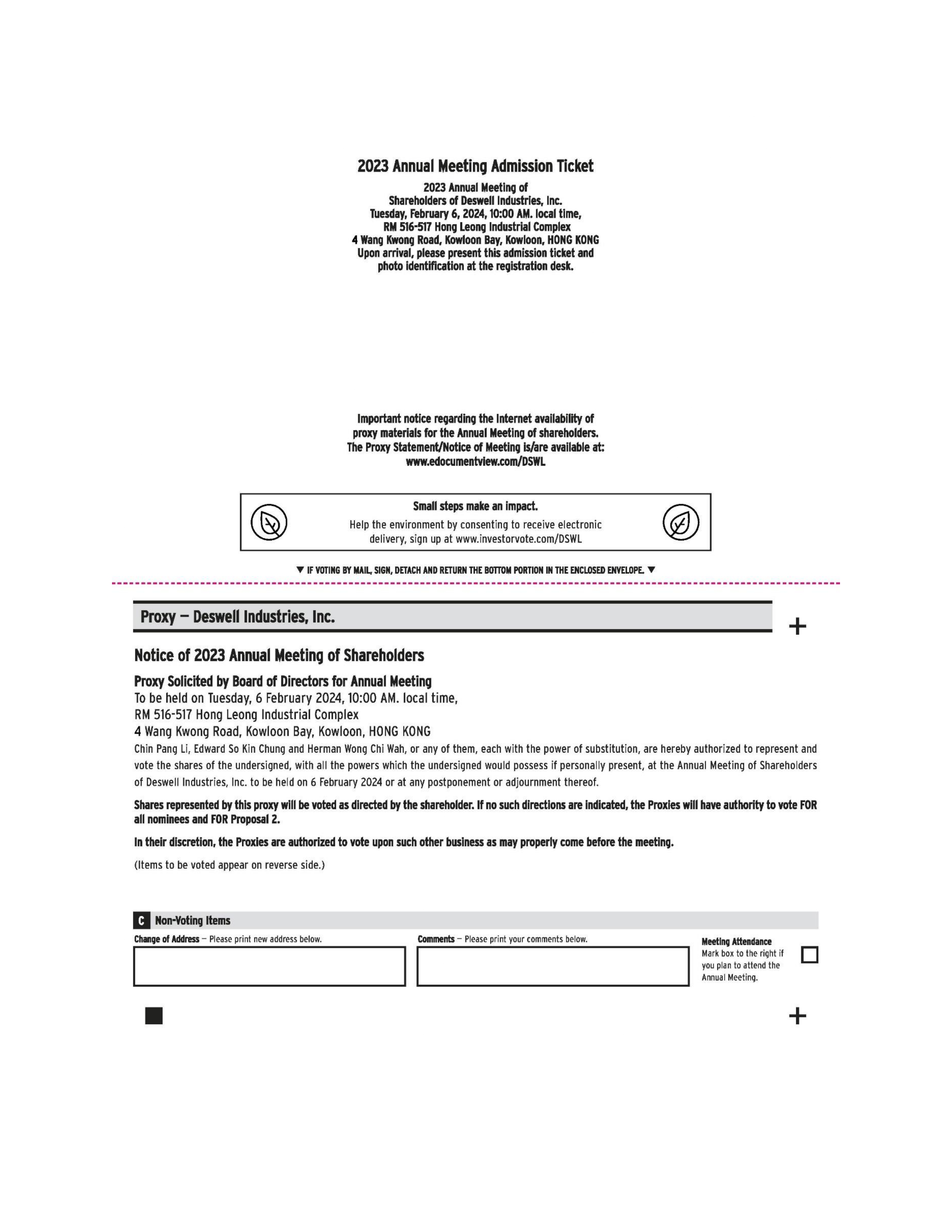 In addition, proxy materials for Deswell’s 2023 Annual Meeting may be accessed and downloaded from the website maintained by Computershare at https://www.edocumentview.com/DSWL. Further inquiries may be obtained by contacting via mail, telephone or email either the Company’s: