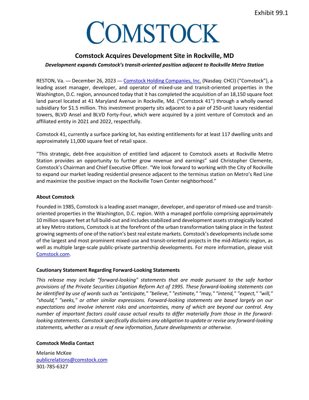 Comstock Acquires Development Site in Rockville, MD Development expands Comstock’s transit-oriented position adjacent to Rockville Metro Station RESTON, Va. — December 26, 2023 — Comstock Holding Companies, Inc. (Nasdaq: CHCI) (“Comstock”), a leading asset manager, developer, and operator of mixed-use and transit-oriented properties in the Washington, D.C. region, announced today that it has completed the acquisition of an 18,150 square foot land parcel located at 41 Maryland Avenue in Rockville, Md. (“Comstock 41”) through a wholly owned subsidiary for $1.5 million. This investment property sits adjacent to a pair of 250-unit luxury residential towers, BLVD Ansel and BLVD Forty-Four, which were acquired by a joint venture of Comstock and an affiliated entity in 2021 and 2022, respectfully. Comstock 41, currently a surface parking lot, has existing entitlements for at least 117 dwelling units and approximately 11,000 square feet of retail space. “This strategic, debt-free acquisition of entitled land adjacent to Comstock assets at Rockville Metro Station provides an opportunity to further grow revenue and earnings” said Christopher Clemente, Comstock’s Chairman and Chief Executive Officer. “We look forward to working with the City of Rockville to expand our market leading residential presence adjacent to the terminus station on Metro’s Red Line and maximize the positive impact on the Rockville Town Center neighborhood.” About Comstock Founded in 1985, Comstock is a leading asset manager, developer, and operator of mixed-use and transit- oriented properties in the Washington, D.C. region. With a managed portfolio comprising approximately 10 million square feet at full build-out and includes stabilized and development assets strategically located at key Metro stations, Comstock is at the forefront of the urban transformation taking place in the fastest growing segments of one of the nation’s best real estate markets. Comstock’s developments include some of the largest and most prominent mixed-use and transit-oriented projects in the mid-Atlantic region, as well as multiple large-scale public-private partnership developments. For more information, please visit Comstock.com. Cautionary Statement Regarding Forward-Looking Statements This release may include "forward-looking" statements that are made pursuant to the safe harbor provisions of the Private Securities Litigation Reform Act of 1995. These forward-looking statements can be identified by use of words such as "anticipate," "believe," "estimate," "may," "intend," "expect," "will," "should," "seeks," or other similar expressions. Forward-looking statements are based largely on our expectations and involve inherent risks and uncertainties, many of which are beyond our control. Any number of important factors could cause actual results to differ materially from those in the forward- looking statements. Comstock specifically disclaims any obligation to update or revise any forward-looking statements, whether as a result of new information, future developments or otherwise. Comstock Media Contact Melanie McKee publicrelations@comstock.com 301-785-6327 Exhibit 99.1
