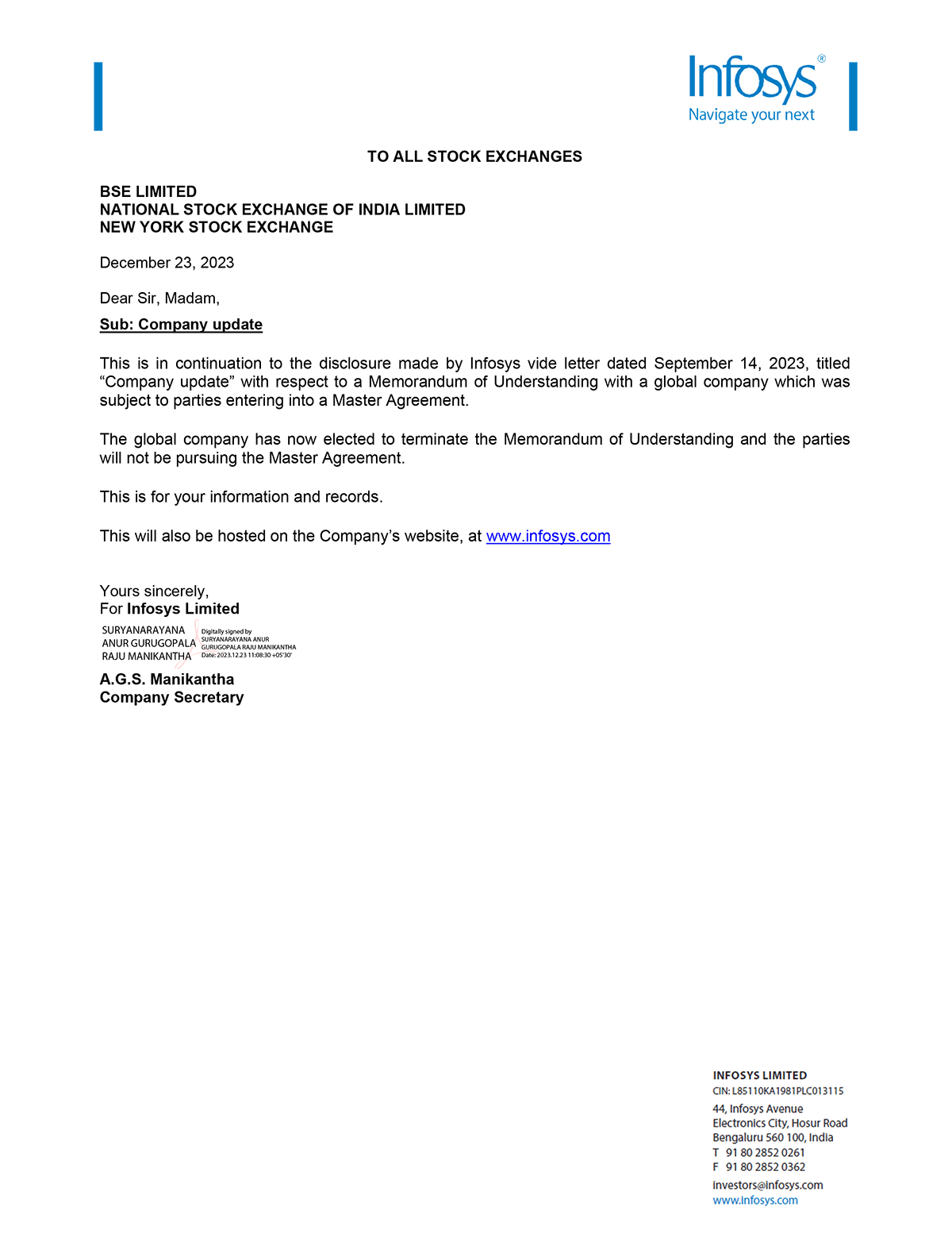 Infosys Limited, a company organized under the laws of the Republic of India ("Infosys", or the "Company"), hereby furnishes with the United States Securities and Exchange Commission this Report on Form 6-K regarding the intimation dated December 23, 2023 pertaining to an update that in continuation to the disclosure made by Infosys vide letter dated September 14, 2023, titled “Company update” with respect to a Memorandum of Understanding with a global company which was subject to parties entering into a Master Agreement. The global company has now elected to terminate the Memorandum of Understanding and the parties will not be pursuing the Master Agreement.