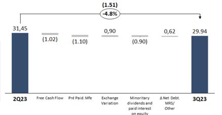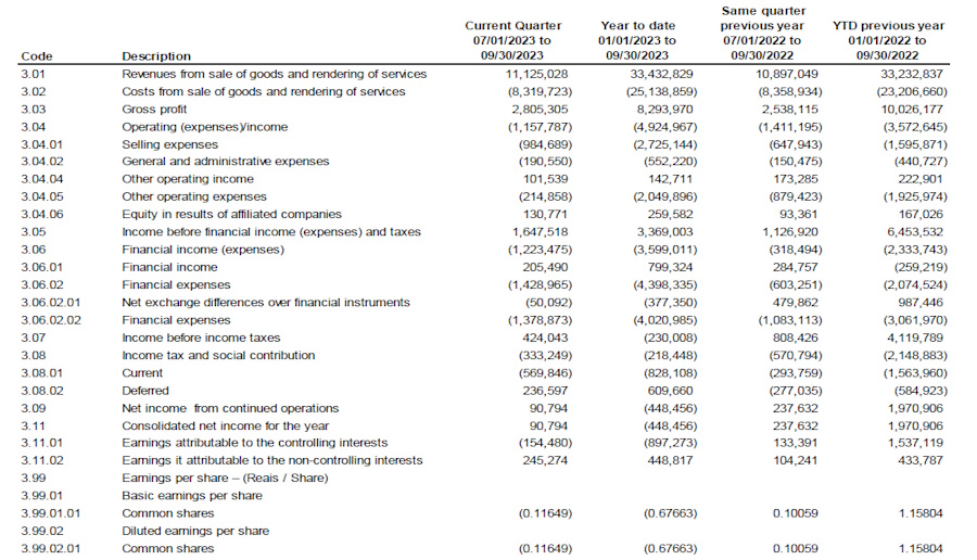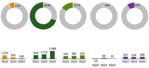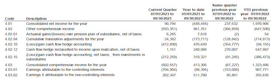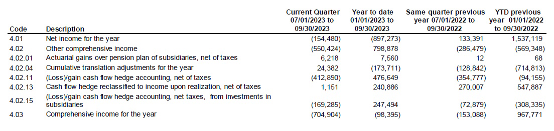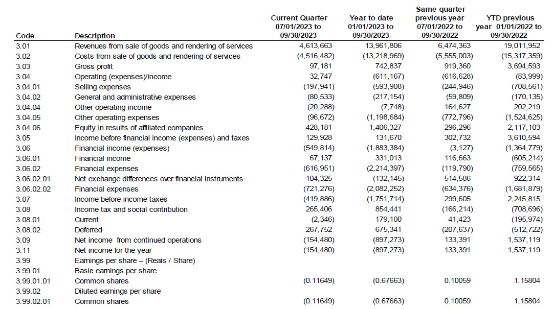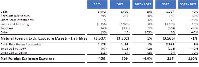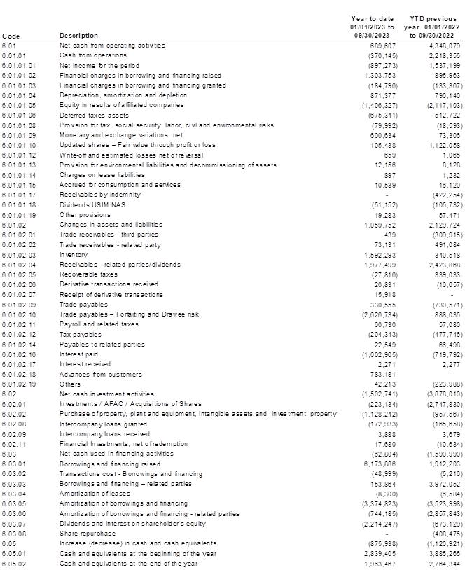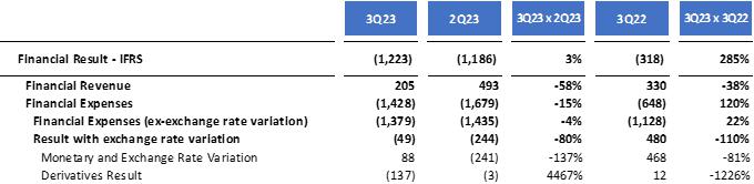| · | In 3Q23, the Financial Result was negative by R$ 1,223 million, in line with the previous quarter, as a consequence of the maintenance of the cost of debt and a lesser impact of Usiminas' shares. |