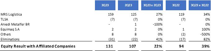 | · | Equity Result was positive by R$ 131 million in 3Q23, an increase of 22.4% compared to the previous quarter, as a result of the strong performance achieved by MRS. |