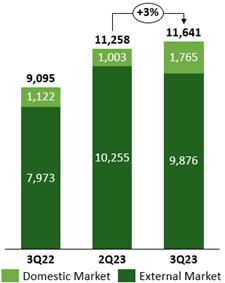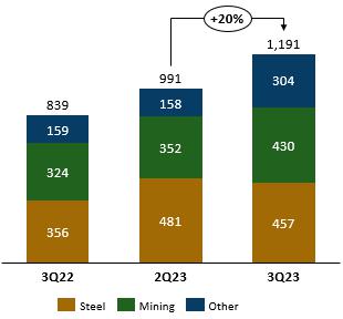 | · | Net Revenue totaled R$ 11,125 million in 3Q23, which represents an increase of 1.2% when compared to 2Q23, mainly as a result of the strong performance in the mining segment, which combined a new sales record with an increase in realized price. In addition, the logistics and cement segments also contributed positively to the higher revenues recorded in the period. |