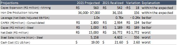 In Dec/21, the Company replaced its estimate of iron ore production volume in 2021 to 36-37 Mton, against a previous expectation of 38-40 Mton.