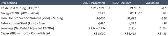 In December/22, the Company added the mining cash cost projection to a level between US$19/ton and US$21/ton in 2023.