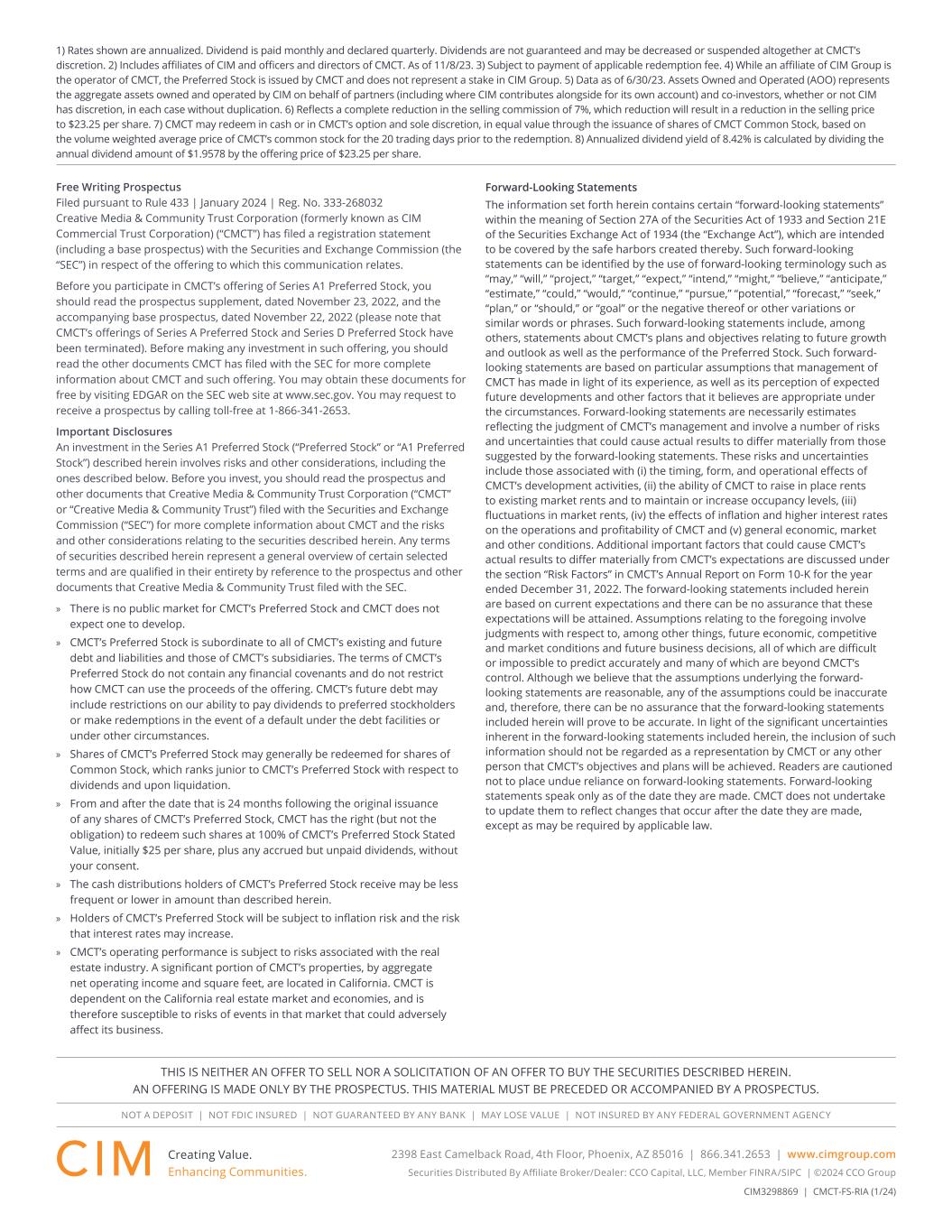 NOT A DEPOSIT | NOT FDIC INSURED | NOT GUARANTEED BY ANY BANK | MAY LOSE VALUE | NOT INSURED BY ANY FEDERAL GOVERNMENT AGENCY Creating Value. Enhancing Communities. 2398 East Camelback Road, 4th Floor, Phoenix, AZ 85016 | 866.341.2653 | www.cimgroup.com Securities Distributed By Affi liate Broker/Dealer: CCO Capital, LLC, Member FINRA/SIPC | ©2024 CCO Group CIM3298869 | CMCT-FS-RIA (1/24) THIS IS NEITHER AN OFFER TO SELL NOR A SOLICITATION OF AN OFFER TO BUY THE SECURITIES DESCRIBED HEREIN. AN OFFERING IS MADE ONLY BY THE PROSPECTUS. THIS MATERIAL MUST BE PRECEDED OR ACCOMPANIED BY A PROSPECTUS. 1) Rates shown are annualized. Dividend is paid monthly and declared quarterly. Dividends are not guaranteed and may be decreased or suspended altogether at CMCT’s discretion. 2) Includes affiliates of CIM and officers and directors of CMCT. As of 11/8/23. 3) Subject to payment of applicable redemption fee. 4) While an affiliate of CIM Group is the operator of CMCT, the Preferred Stock is issued by CMCT and does not represent a stake in CIM Group. 5) Data as of 6/30/23. Assets Owned and Operated (AOO) represents the aggregate assets owned and operated by CIM on behalf of partners (including where CIM contributes alongside for its own account) and co-investors, whether or not CIM has discretion, in each case without duplication. 6) Reflects a complete reduction in the selling commission of 7%, which reduction will result in a reduction in the selling price to $23.25 per share. 7) CMCT may redeem in cash or in CMCT’s option and sole discretion, in equal value through the issuance of shares of CMCT Common Stock, based on the volume weighted average price of CMCT’s common stock for the 20 trading days prior to the redemption. 8) Annualized dividend yield of 8.42% is calculated by dividing the annual dividend amount of $1.9578 by the offering price of $23.25 per share. Free Writing Prospectus Filed pursuant to Rule 433 | January 2024 | Reg. No. 333-268032 Creative Media & Community Trust Corporation (formerly known as CIM Commercial Trust Corporation) (“CMCT”) has filed a registration statement (including a base prospectus) with the Securities and Exchange Commission (the “SEC”) in respect of the offering to which this communication relates. Before you participate in CMCT’s offering of Series A1 Preferred Stock, you should read the prospectus supplement, dated November 23, 2022, and the accompanying base prospectus, dated November 22, 2022 (please note that CMCT’s offerings of Series A Preferred Stock and Series D Preferred Stock have been terminated). Before making any investment in such offering, you should read the other documents CMCT has filed with the SEC for more complete information about CMCT and such offering. You may obtain these documents for free by visiting EDGAR on the SEC web site at www.sec.gov. You may request to receive a prospectus by calling toll-free at 1-866-341-2653. Important Disclosures An investment in the Series A1 Preferred Stock (“Preferred Stock” or “A1 Preferred Stock”) described herein involves risks and other considerations, including the ones described below. Before you invest, you should read the prospectus and other documents that Creative Media & Community Trust Corporation (“CMCT” or “Creative Media & Community Trust”) filed with the Securities and Exchange Commission (“SEC”) for more complete information about CMCT and the risks and other considerations relating to the securities described herein. Any terms of securities described herein represent a general overview of certain selected terms and are qualified in their entirety by reference to the prospectus and other documents that Creative Media & Community Trust filed with the SEC. » There is no public market for CMCT’s Preferred Stock and CMCT does not expect one to develop. » CMCT’s Preferred Stock is subordinate to all of CMCT’s existing and future debt and liabilities and those of CMCT’s subsidiaries. The terms of CMCT’s Preferred Stock do not contain any financial covenants and do not restrict how CMCT can use the proceeds of the offering. CMCT’s future debt may include restrictions on our ability to pay dividends to preferred stockholders or make redemptions in the event of a default under the debt facilities or under other circumstances. » Shares of CMCT’s Preferred Stock may generally be redeemed for shares of Common Stock, which ranks junior to CMCT’s Preferred Stock with respect to dividends and upon liquidation. » From and after the date that is 24 months following the original issuance of any shares of CMCT’s Preferred Stock, CMCT has the right (but not the obligation) to redeem such shares at 100% of CMCT’s Preferred Stock Stated Value, initially $25 per share, plus any accrued but unpaid dividends, without your consent. » The cash distributions holders of CMCT’s Preferred Stock receive may be less frequent or lower in amount than described herein. » Holders of CMCT’s Preferred Stock will be subject to inflation risk and the risk that interest rates may increase. » CMCT’s operating performance is subject to risks associated with the real estate industry. A significant portion of CMCT’s properties, by aggregate net operating income and square feet, are located in California. CMCT is dependent on the California real estate market and economies, and is therefore susceptible to risks of events in that market that could adversely affect its business. Forward-Looking Statements The information set forth herein contains certain “forward-looking statements” within the meaning of Section 27A of the Securities Act of 1933 and Section 21E of the Securities Exchange Act of 1934 (the “Exchange Act”), which are intended to be covered by the safe harbors created thereby. Such forward-looking statements can be identified by the use of forward-looking terminology such as “may,” “will,” “project,” “target,” “expect,