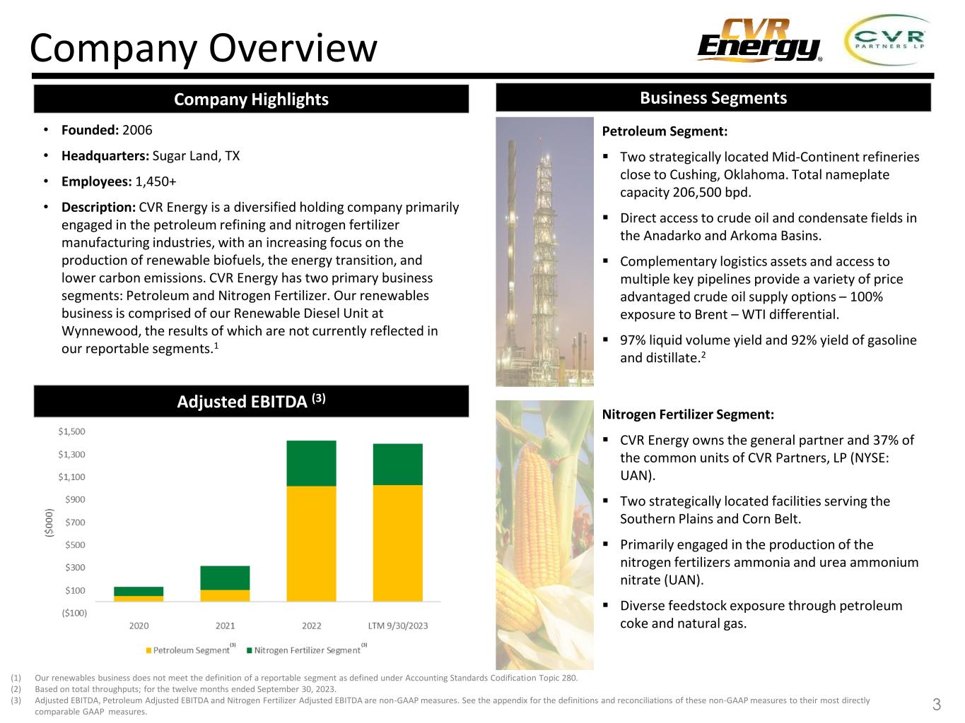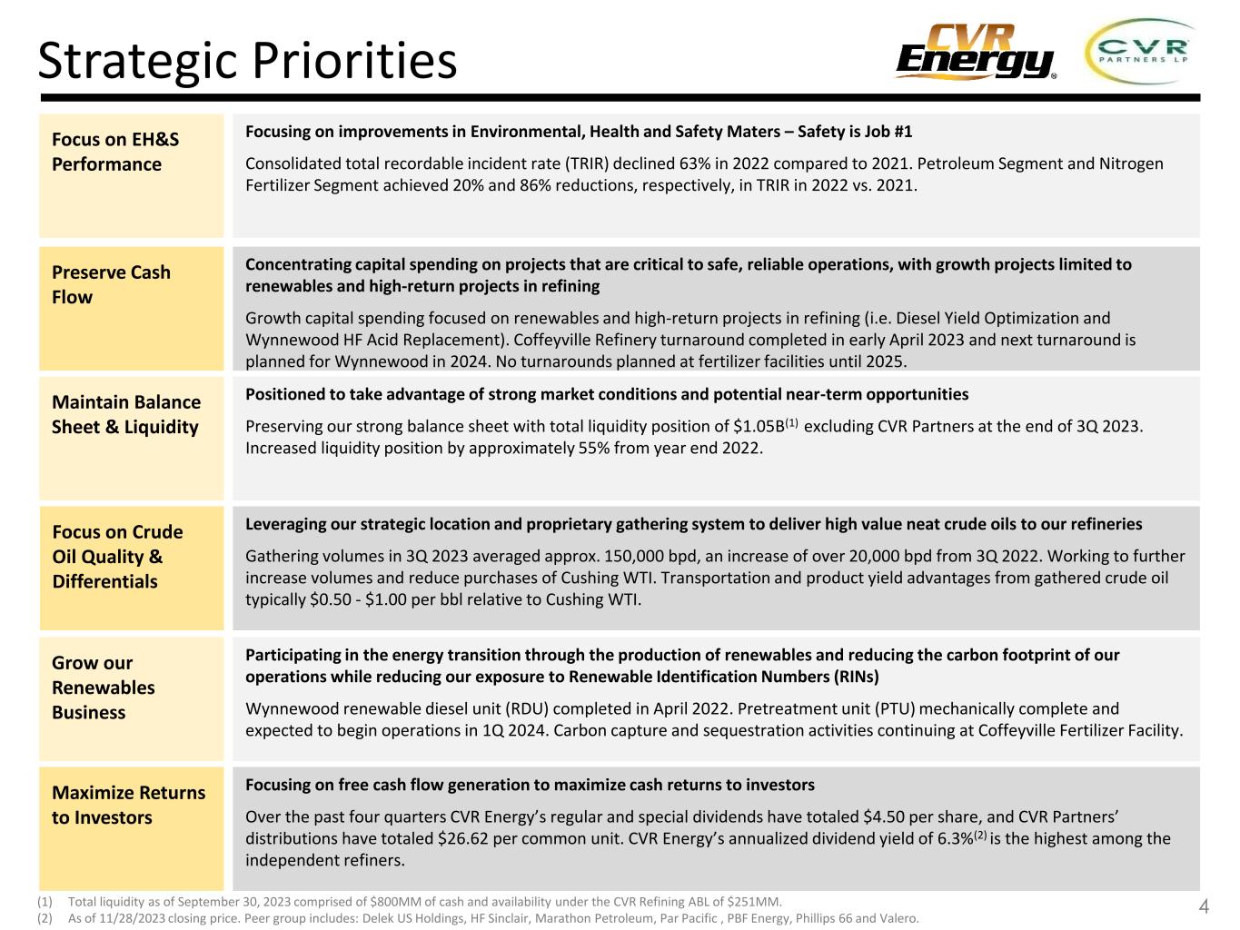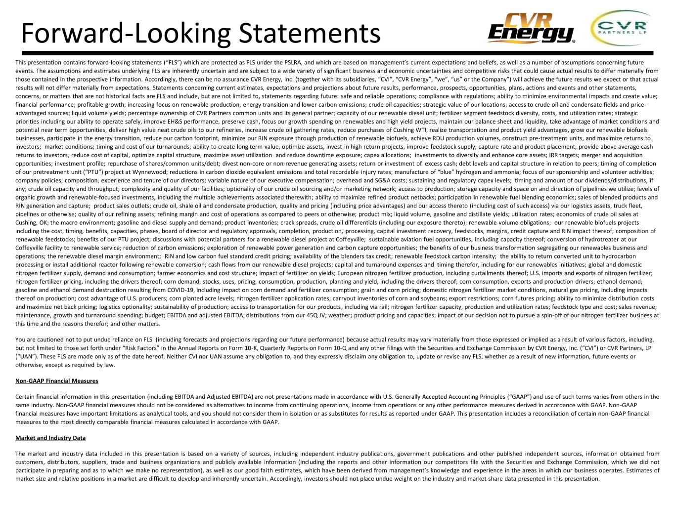 This presentation contains forward-looking statements (“FLS”) which are protected as FLS under the PSLRA, and which are based on management’s current expectations and beliefs, as well as a number of assumptions concerning future events. The assumptions and estimates underlying FLS are inherently uncertain and are subject to a wide variety of significant business and economic uncertainties and competitive risks that could cause actual results to differ materially from those contained in the prospective information. Accordingly, there can be no assurance CVR Energy, Inc. (together with its subsidiaries, “CVI”, “CVR Energy”, “we”, “us” or the Company”) will achieve the future results we expect or that actual results will not differ materially from expectations. Statements concerning current estimates, expectations and projections about future results, performance, prospects, opportunities, plans, actions and events and other statements, concerns, or matters that are not historical facts are FLS and include, but are not limited to, statements regarding future: safe and reliable operations; compliance with regulations; ability to minimize environmental impacts and create value; financial performance; profitable growth; increasing focus on renewable production, energy transition and lower carbon emissions; crude oil capacities; strategic value of our locations; access to crude oil and condensate fields and price- advantaged sources; liquid volume yields; percentage ownership of CVR Partners common units and its general partner; capacity of our renewable diesel unit; fertilizer segment feedstock diversity, costs, and utilization rates; strategic priorities including our ability to operate safely, improve EH&S performance, preserve cash, focus our growth spending on renewables and high yield projects, maintain our balance sheet and liquidity, take advantage of market conditions and potential near term opportunities, deliver high value neat crude oils to our refineries, increase crude oil gathering rates, reduce purchases of Cushing WTI, realize transportation and product yield advantages, grow our renewable biofuels businesses, participate in the energy transition, reduce our carbon footprint, minimize our RIN exposure through production of renewable biofuels, achieve RDU production volumes, construct pre-treatment units, and maximize returns to investors; market conditions; timing and cost of our turnarounds; ability to create long term value, optimize assets, invest in high return projects, improve feedstock supply, capture rate and product placement, provide above average cash returns to investors, reduce cost of capital, optimize capital structure, maximize asset utilization and reduce downtime exposure; capex allocations; investments to diversify and enhance core assets; IRR targets; merger and acquisition opportunities; investment profile; repurchase of shares/common units/debt; divest non-core or non-revenue generating assets; return or investment of excess cash; debt levels and capital structure in relation to peers; timing of completion of our pretreatment unit (“PTU”) project at Wynnewood; reductions in carbon dioxide equivalent emissions and total recordable injury rates; manufacture of “blue” hydrogen and ammonia; focus of our sponsorship and volunteer activities; company policies; composition, experience and tenure of our directors; variable nature of our executive compensation; overhead and SG&A costs; sustaining and regulatory capex levels; timing and amount of our dividends/distributions, if any; crude oil capacity and throughput; complexity and quality of our facilities; optionality of our crude oil sourcing and/or marketing network; access to production; storage capacity and space on and direction of pipelines we utilize; levels of organic growth and renewable-focused investments, including the multiple achievements associated therewith; ability to maximize refined product netbacks; participation in renewable fuel blending economics; sales of blended products and RIN generation and capture; product sales outlets; crude oil, shale oil and condensate production, quality and pricing (including price advantages) and our access thereto (including cost of such access) via our logistics assets, truck fleet, pipelines or otherwise; quality of our refining assets; refining margin and cost of operations as compared to peers or otherwise; product mix; liquid volume, gasoline and distillate yields; utilization rates; economics of crude oil sales at Cushing, OK; the macro environment; gasoline and diesel supply and demand; product inventories; crack spreads, crude oil differentials (including our exposure thereto); renewable volume obligations; our renewable biofuels projects including the cost, timing, benefits, capacities, phases, board of director and regulatory approvals, completion, production, processing, capital investment recovery, feedstocks, margins, credit capture and RIN impact thereof; composition of renewable feedstocks; benefits of our PTU project; discussions with potential partners for a renewable diesel project at Coffeyville; sustainable aviation fuel opportunities, including capacity thereof; conversion of hydrotreater at our Coffeyville facility to renewable service; reduction of carbon emissions; exploration of renewable power generation and carbon capture opportunities; the benefits of our business transformation segregating our renewables business and operations; the renewable diesel margin environment; RIN and low carbon fuel standard credit pricing; availability of the blenders tax credit; renewable feedstock carbon intensity; the ability to return converted unit to hydrocarbon processing or install additional reactor following renewable conversion; cash flows from our renewable diesel projects; capital and turnaround expenses and timing therefor, including for our renewables initiatives; global and domestic nitrogen fertilizer suppl