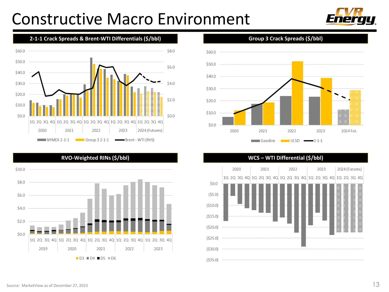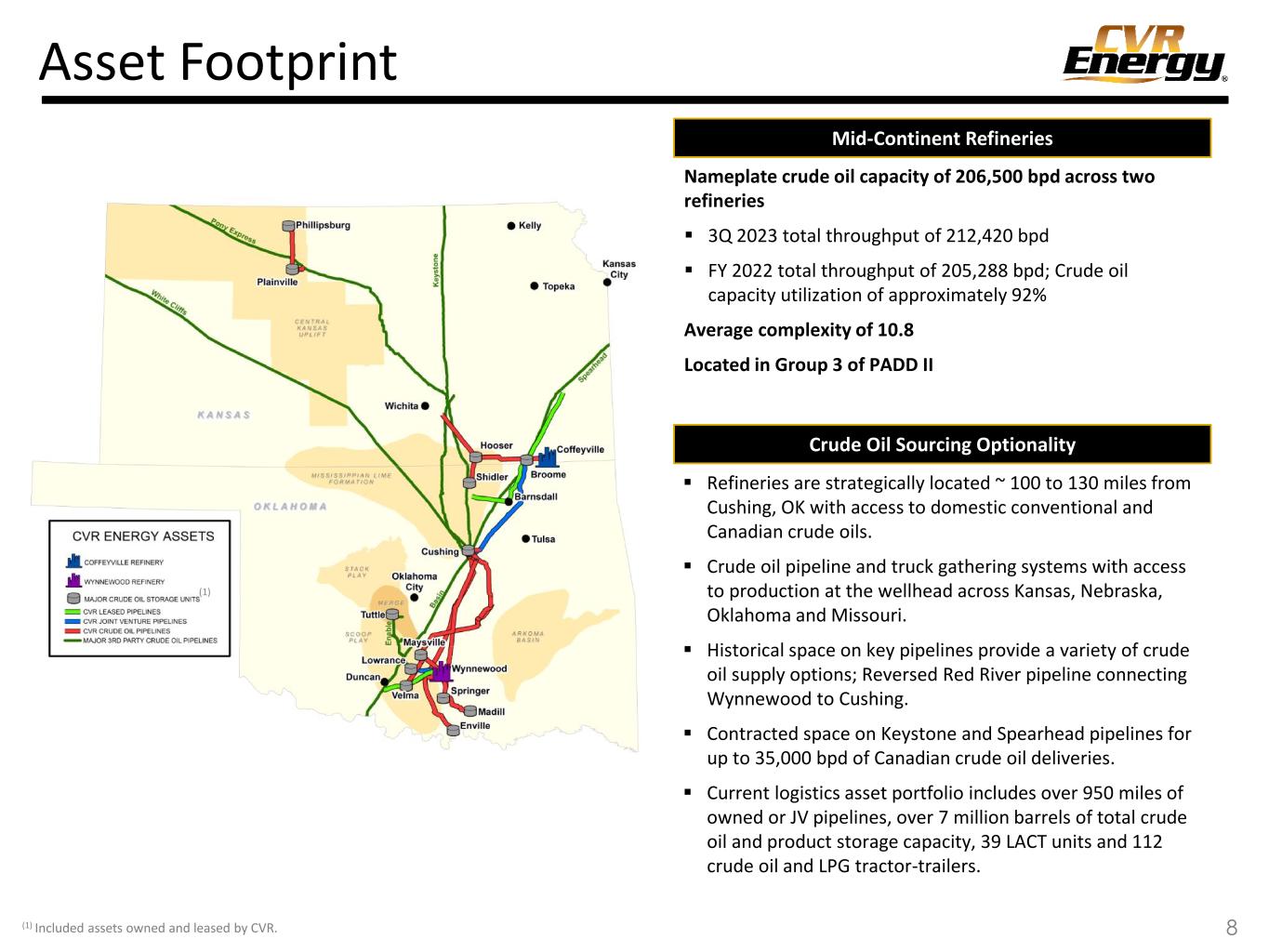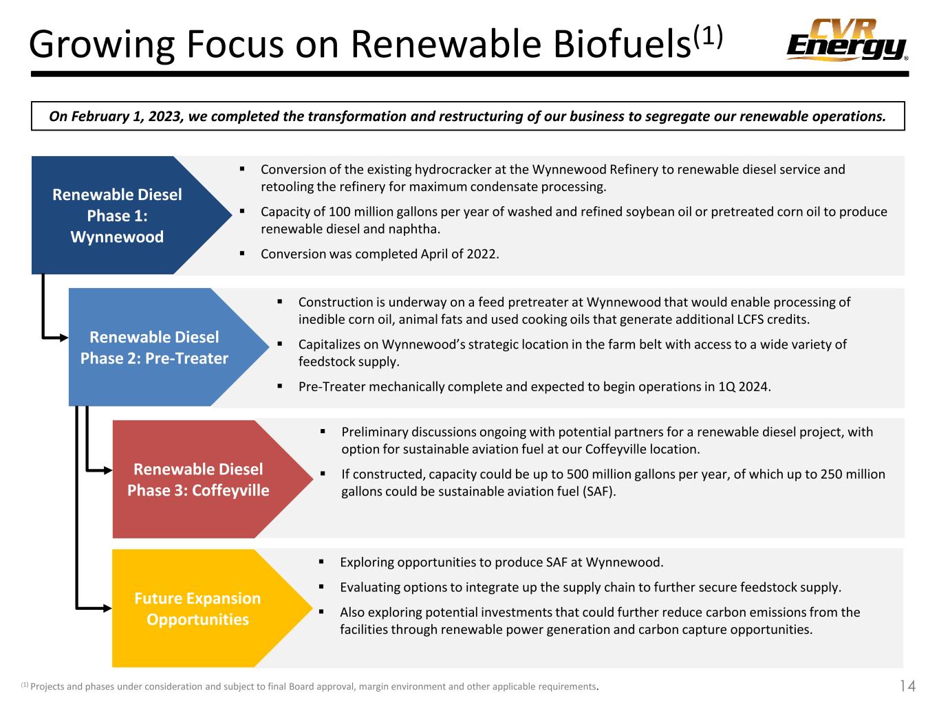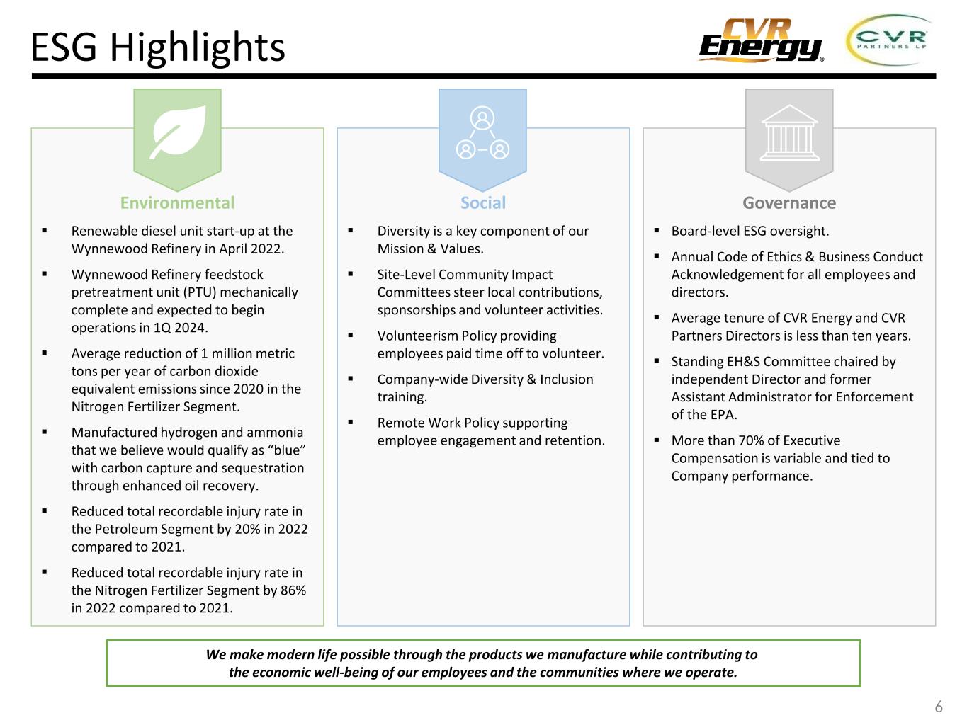This presentation contains forward-looking statements (“FLS”) which are protected as FLS under the PSLRA, and which are based on management’s current expectations and beliefs, as well as a number of assumptions concerning future events. The assumptions and estimates underlying FLS are inherently uncertain and are subject to a wide variety of significant business and economic uncertainties and competitive risks that could cause actual results to differ materially from those contained in the prospective information. Accordingly, there can be no assurance CVR Energy, Inc. (together with its subsidiaries, “CVI”, “CVR Energy”, “we”, “us” or the Company”) will achieve the future results we expect or that actual results will not differ materially from expectations. Statements concerning current estimates, expectations and projections about future results, performance, prospects, opportunities, plans, actions and events and other statements, concerns, or matters that are not historical facts are FLS and include, but are not limited to, statements regarding future: safe and reliable operations; compliance with regulations; ability to minimize environmental impacts and create value; financial performance; profitable growth; increasing focus on renewable production, energy transition and lower carbon emissions; crude oil capacities; strategic value of our locations; access to crude oil and condensate fields and price- advantaged sources; liquid volume yields; percentage ownership of CVR Partners common units and its general partner; capacity of our renewable diesel unit; fertilizer segment feedstock diversity, costs, and utilization rates; strategic priorities including our ability to operate safely, improve EH&S performance, preserve cash, focus our growth spending on renewables and high yield projects, maintain our balance sheet and liquidity, take advantage of market conditions and potential near term opportunities, deliver high value neat crude oils to our refineries, increase crude oil gathering rates, reduce purchases of Cushing WTI, realize transportation and product yield advantages, grow our renewable biofuels businesses, participate in the energy transition, reduce our carbon footprint, minimize our RIN exposure through production of renewable biofuels, achieve RDU production volumes, construct pre-treatment units, and maximize returns to investors; market conditions; timing and cost of our turnarounds; ability to create long term value, optimize assets, invest in high return projects, improve feedstock supply, capture rate and product placement, provide above average cash returns to investors, reduce cost of capital, optimize capital structure, maximize asset utilization and reduce downtime exposure; capex allocations; investments to diversify and enhance core assets; IRR targets; merger and acquisition opportunities; investment profile; repurchase of shares/common units/debt; divest non-core or non-revenue generating assets; return or investment of excess cash; debt levels and capital structure in relation to peers; timing of completion of our pretreatment unit (“PTU”) project at Wynnewood; reductions in carbon dioxide equivalent emissions and total recordable injury rates; manufacture of “blue” hydrogen and ammonia; focus of our sponsorship and volunteer activities; company policies; composition, experience and tenure of our directors; variable nature of our executive compensation; overhead and SG&A costs; sustaining and regulatory capex levels; timing and amount of our dividends/distributions, if any; crude oil capacity and throughput; complexity and quality of our facilities; optionality of our crude oil sourcing and/or marketing network; access to production; storage capacity and space on and direction of pipelines we utilize; levels of organic growth and renewable-focused investments, including the multiple achievements associated therewith; ability to maximize refined product netbacks; participation in renewable fuel blending economics; sales of blended products and RIN generation and capture; product sales outlets; crude oil, shale oil and condensate production, quality and pricing (including price advantages) and our access thereto (including cost of such access) via our logistics assets, truck fleet, pipelines or otherwise; quality of our refining assets; refining margin and cost of operations as compared to peers or otherwise; product mix; liquid volume, gasoline and distillate yields; utilization rates; economics of crude oil sales at Cushing, OK; the macro environment; gasoline and diesel supply and demand; product inventories; crack spreads, crude oil differentials (including our exposure thereto); renewable volume obligations; our renewable biofuels projects including the cost, timing, benefits, capacities, phases, board of director and regulatory approvals, completion, production, processing, capital investment recovery, feedstocks, margins, credit capture and RIN impact thereof; composition of renewable feedstocks; benefits of our PTU project; discussions with potential partners for a renewable diesel project at Coffeyville; sustainable aviation fuel opportunities, including capacity thereof; conversion of hydrotreater at our Coffeyville facility to renewable service; reduction of carbon emissions; exploration of renewable power generation and carbon capture opportunities; the benefits of our business transformation segregating our renewables business and operations; the renewable diesel margin environment; RIN and low carbon fuel standard credit pricing; availability of the blenders tax credit; renewable feedstock carbon intensity; the ability to return converted unit to hydrocarbon processing or install additional reactor following renewable conversion; cash flows from our renewable diesel projects; capital and turnaround expenses and timing therefor, including for our renewables initiatives; global and domestic nitrogen fertilizer suppl