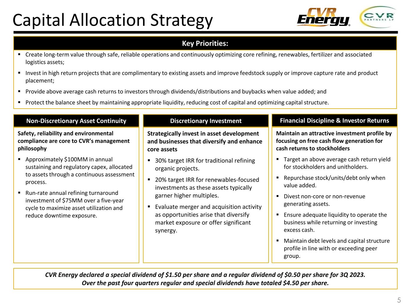 Strategic Priorities Focus on EH&S Performance Preserve Cash Flow Maintain Balance Sheet & Liquidity Focus on Crude Oil Quality & Differentials Grow our Renewables Business Maximize Returns to Investors Focusing on improvements in Environmental, Health and Safety Maters – Safety is Job #1 Consolidated total recordable incident rate (TRIR) declined 63% in 2022 compared to 2021. Petroleum Segment and Nitrogen Fertilizer Segment achieved 20% and 86% reductions, respectively, in TRIR in 2022 vs. 2021. Concentrating capital spending on projects that are critical to safe, reliable operations, with growth projects limited to renewables and high-return projects in refining Growth capital spending focused on renewables and high-return projects in refining (i.e. Diesel Yield Optimization and Wynnewood HF Acid Replacement). Coffeyville Refinery turnaround completed in early April 2023 and next turnaround is planned for Wynnewood in 2024. No turnarounds planned at fertilizer facilities until 2025. Positioned to take advantage of strong market conditions and potential near-term opportunities Preserving our strong balance sheet with total liquidity position of $1.05B(1) excluding CVR Partners at the end of 3Q 2023. Increased liquidity position by approximately 55% from year end 2022. Leveraging our strategic location and proprietary gathering system to deliver high value neat crude oils to our refineries Gathering volumes in 3Q 2023 averaged approx. 150,000 bpd, an increase of over 20,000 bpd from 3Q 2022. Working to further increase volumes and reduce purchases of Cushing WTI. Transportation and product yield advantages from gathered crude oil typically $0.50 - $1.00 per bbl relative to Cushing WTI. Participating in the energy transition through the production of renewables and reducing the carbon footprint of our operations while reducing our exposure to Renewable Identification Numbers (RINs) Wynnewood renewable diesel unit (RDU) completed in April 2022. Pretreatment unit (PTU) mechanically complete and expected to begin operations in 1Q 2024. Carbon capture and sequestration activities continuing at Coffeyville Fertilizer Facility. Focusing on free cash flow generation to maximize cash returns to investors Over the past four quarters CVR Energy’s regular and special dividends have totaled $4.50 per share, and CVR Partners’ distributions have totaled $26.62 per common unit. CVR Energy’s annualized dividend yield of 6.3%(2) is the highest among the independent refiners. 4(1) Total liquidity as of September 30, 2023 comprised of $800MM of cash and availability under the CVR Refining ABL of $251MM. (2) As of 11/28/2023 closing price. Peer group includes: Delek US Holdings, HF Sinclair, Marathon Petroleum, Par Pacific , PBF Energy, Phillips 66 and Valero.