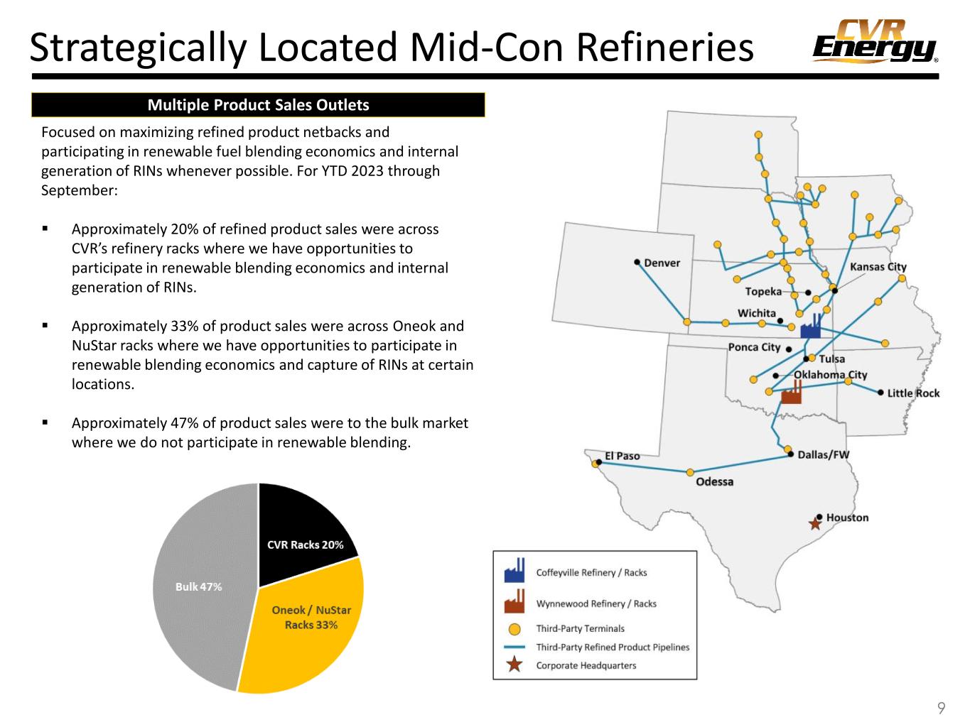 Asset Footprint 8 Nameplate crude oil capacity of 206,500 bpd across two refineries ▪ 3Q 2023 total throughput of 212,420 bpd ▪ FY 2022 total throughput of 205,288 bpd; Crude oil capacity utilization of approximately 92% Average complexity of 10.8 Located in Group 3 of PADD II ▪ Refineries are strategically located ~ 100 to 130 miles from Cushing, OK with access to domestic conventional and Canadian crude oils. ▪ Crude oil pipeline and truck gathering systems with access to production at the wellhead across Kansas, Nebraska, Oklahoma and Missouri. ▪ Historical space on key pipelines provide a variety of crude oil supply options; Reversed Red River pipeline connecting Wynnewood to Cushing. ▪ Contracted space on Keystone and Spearhead pipelines for up to 35,000 bpd of Canadian crude oil deliveries. ▪ Current logistics asset portfolio includes over 950 miles of owned or JV pipelines, over 7 million barrels of total crude oil and product storage capacity, 39 LACT units and 112 crude oil and LPG tractor-trailers. Mid-Continent Refineries Crude Oil Sourcing Optionality (1) Included assets owned and leased by CVR. (1)