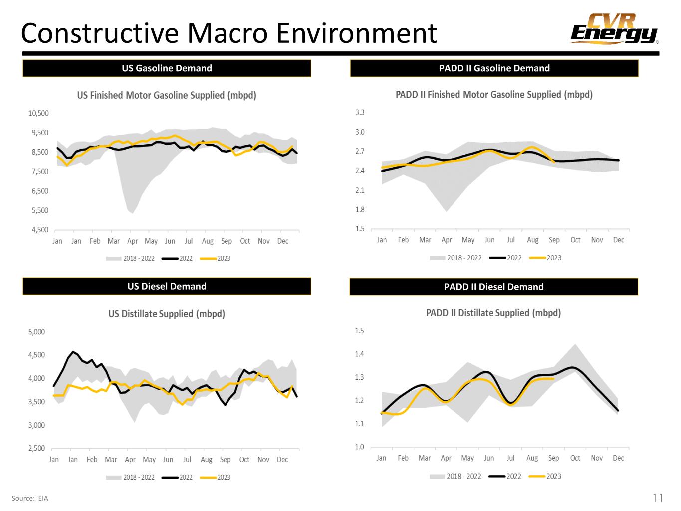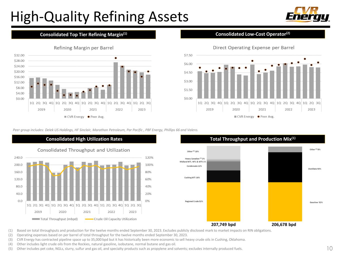 High-Quality Refining Assets Consolidated High Utilization Rates Total Throughput and Production Mix(1) Consolidated Top Tier Refining Margin(1) Consolidated Low-Cost Operator(2) (1) Based on total throughputs and production for the twelve months ended September 30, 2023. Excludes publicly disclosed mark to market impacts on RIN obligations. (2) Operating expenses based on per barrel of total throughput for the twelve months ended September 30, 2023. (3) CVR Energy has contracted pipeline space up to 35,000 bpd but it has historically been more economic to sell heavy crude oils in Cushing, Oklahoma. (4) Other includes light crude oils from the Rockies, natural gasoline, isobutane, normal butane and gas oil. (5) Other includes pet coke, NGLs, slurry, sulfur and gas oil, and specialty products such as propylene and solvents; excludes internally produced fuels.. 207,749 bpd 206,678 bpd 10 Peer group includes: Delek US Holdings, HF Sinclair, Marathon Petroleum, Par Pacific , PBF Energy, Phillips 66 and Valero.