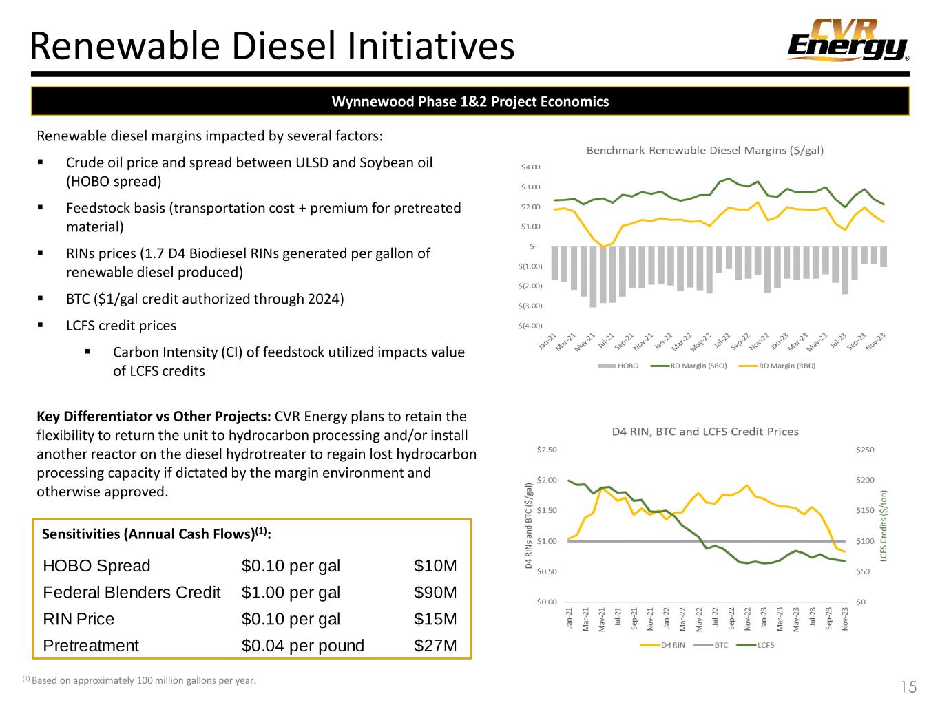 ▪ Construction is underway on a feed pretreater at Wynnewood that would enable processing of inedible corn oil, animal fats and used cooking oils that generate additional LCFS credits. ▪ Capitalizes on Wynnewood’s strategic location in the farm belt with access to a wide variety of feedstock supply. ▪ Pre-Treater mechanically complete and expected to begin operations in 1Q 2024. ▪ Preliminary discussions ongoing with potential partners for a renewable diesel project, with option for sustainable aviation fuel at our Coffeyville location. ▪ If constructed, capacity could be up to 500 million gallons per year, of which up to 250 million gallons could be sustainable aviation fuel (SAF). ▪ Exploring opportunities to produce SAF at Wynnewood. ▪ Evaluating options to integrate up the supply chain to further secure feedstock supply. ▪ Also exploring potential investments that could further reduce carbon emissions from the facilities through renewable power generation and carbon capture opportunities. ▪ Conversion of the existing hydrocracker at the Wynnewood Refinery to renewable diesel service and retooling the refinery for maximum condensate processing. ▪ Capacity of 100 million gallons per year of washed and refined soybean oil or pretreated corn oil to produce renewable diesel and naphtha. ▪ Conversion was completed April of 2022. Renewable Diesel Phase 1: Wynnewood Renewable Diesel Phase 2: Pre-Treater Renewable Diesel Phase 3: Coffeyville Future Expansion Opportunities Growing Focus on Renewable Biofuels(1) (1) Projects and phases under consideration and subject to final Board approval, margin environment and other applicable requirements. On February 1, 2023, we completed the transformation and restructuring of our business to segregate our renewable operations. 14