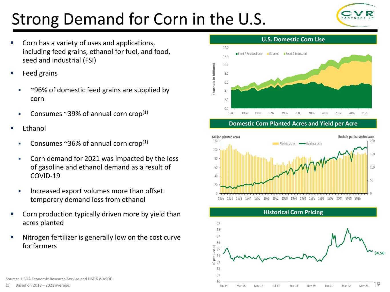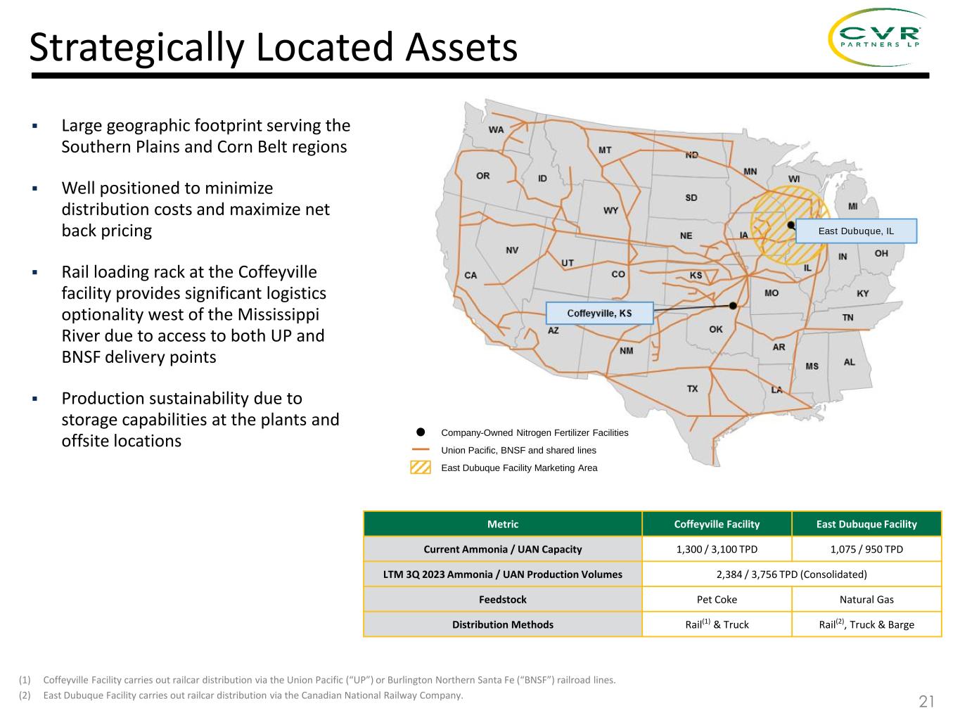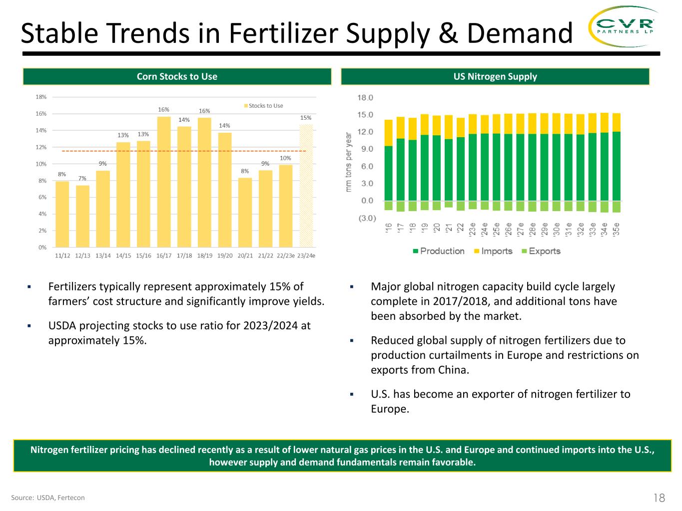 ▪ Summer UAN fill and fall prepay ammonia programs completed in July. Strong demand for nitrogen going into 4Q with consistent buying taking place as growers are in strong financial conditions. Corn Belt UAN and Ammonia prices for 4Q delivery currently approximately $280 - $300/ton and $510 - $525/ton, respectively. ▪ Spot natural gas prices have remained low in Europe and the United States, although forward TTF prices for 4Q 2023 are in the range of $15 - $20 per MMBtu, compared to $2.00 - $3.00 per MMBtu in the U.S. ▪ Planted corn acres estimated at 94 million in 2023, with yields of 175 bushels per acre resulting in ending inventories near the ten-year average 2 0 2 2 Recent Domestic Nitrogen Fertilizer Market Conditions 2 0 2 3 ▪ UAN and Ammonia prices approximately $400/ton and $800/ton, respectively for 1Q 2023 shipment. ▪ Natural gas prices in the U.S. and Europe declined dramatically, sparking speculation in the market around curtailed European production restarting. Despite the decline in European natural gas prices, U.S. fertilizer producers maintain a significant cost advantage vs. European producers. ▪ Planted corn acres expected to be 91 – 93 million in 2023. ▪ Nitrogen values supportive of higher application rates per acre than they were in 2022. Summer Spring ▪ UAN and Ammonia prices approximately $300/ton and $500/ton, respectively for 2Q 2023 shipment. ▪ Some of the curtailed European nitrogen fertilizer production capacity returned amid lower natural gas price environment and imports of fertilizers into the U.S. continued, which reduced concerns around supply availability. ▪ Planted corn acres estimated at 90.5 to 91.5 million in 2023 compared to 88.5 million in 2022. 20 Winter Fall ▪ USDA estimates 94.9 million acres of corn were planted in 2023 with harvested acres of 87.1 million and yields of 174.9 bushels per acre, resulting in carryout inventories near the ten-year average. ▪ Harvest completed in early November and demand was high for Fall ammonia application. Corn Belt UAN and Ammonia market prices for 4Q approximately $290/ton and $725/ton, respectively. ▪ Spot natural gas prices remained low in Europe and the United States, although forward TTF prices for 4Q 2023 are in the range of $15 - $20 per MMBtu, compared to $2.00 - $3.00 per MMBtu in the U.S. ▪ December 2024 corn futures prices over $5.00/bu. With strong farm economics for 2024 some farmers are deferring 2023 production and selling into 2024.