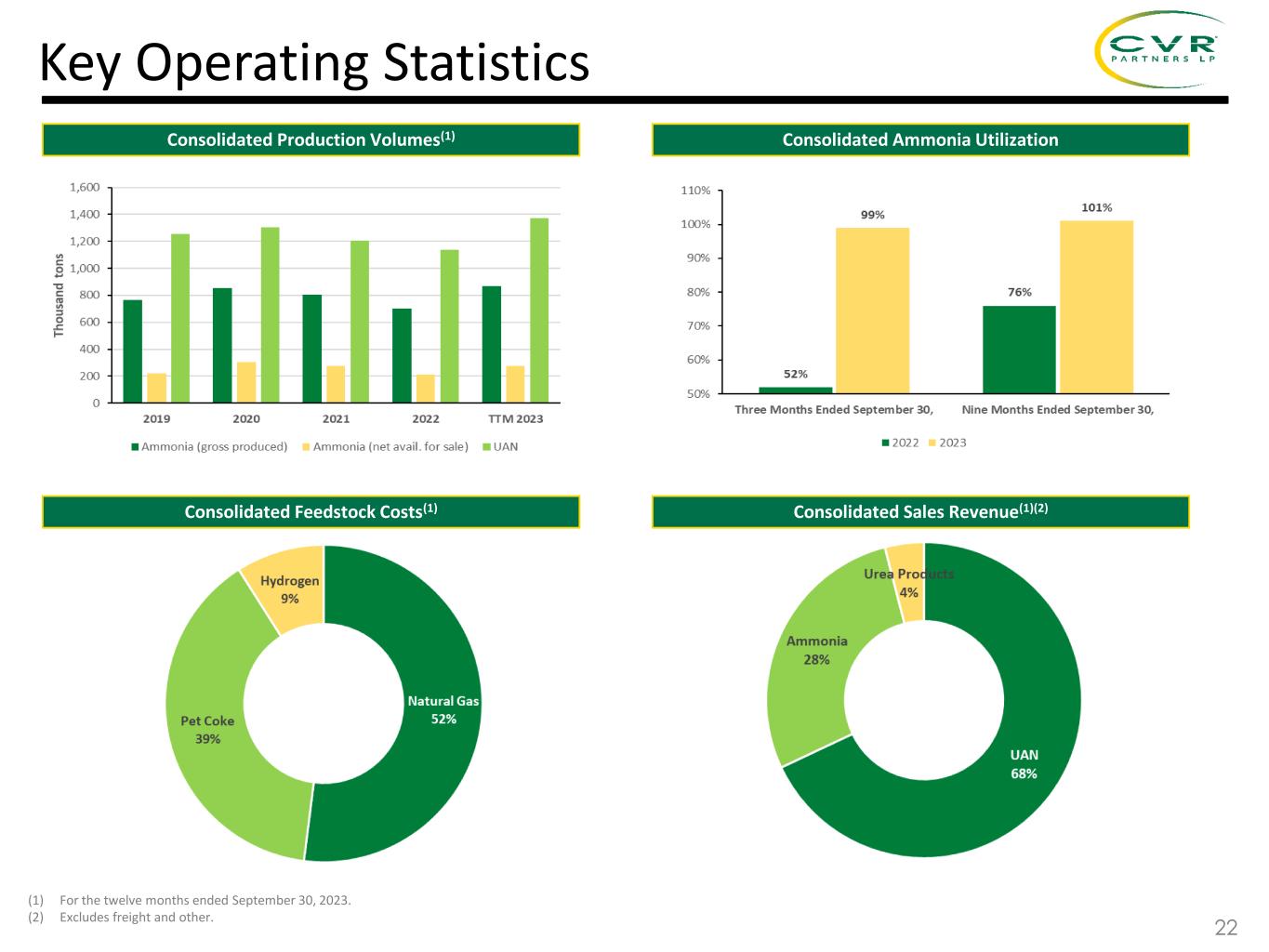 ▪ Large geographic footprint serving the Southern Plains and Corn Belt regions ▪ Well positioned to minimize distribution costs and maximize net back pricing ▪ Rail loading rack at the Coffeyville facility provides significant logistics optionality west of the Mississippi River due to access to both UP and BNSF delivery points ▪ Production sustainability due to storage capabilities at the plants and offsite locations (1) Coffeyville Facility carries out railcar distribution via the Union Pacific (“UP”) or Burlington Northern Santa Fe (“BNSF”) railroad lines. (2) East Dubuque Facility carries out railcar distribution via the Canadian National Railway Company. Union Pacific, BNSF and shared lines Company-Owned Nitrogen Fertilizer Facilities East Dubuque Facility Marketing Area Metric Coffeyville Facility East Dubuque Facility Current Ammonia / UAN Capacity 1,300 / 3,100 TPD 1,075 / 950 TPD LTM 3Q 2023 Ammonia / UAN Production Volumes 2,384 / 3,756 TPD (Consolidated) Feedstock Pet Coke Natural Gas Distribution Methods Rail(1) & Truck Rail(2), Truck & Barge Strategically Located Assets 21 East Dubuque, IL
