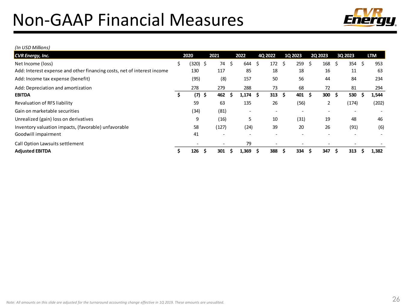 Non-GAAP Financial Measures 25 Adjusted EBITDA – EBITDA adjusted for certain significant non-cash items and items that management believes are not attributable to or indicative of our on-going operations or that may obscure our underlying results and trends. Direct Operating Expenses per Throughput Barrel represents direct operating expenses for the Company’s Petroleum segment divided by total throughput barrels during the period, which is calculated as total throughput barrels per day times the number of days in the period. EBITDA represents net income (loss) before (i) interest expense, net, (ii) income tax expense (benefit) and (iii) depreciation and amortization expense. Refining Margin represents the difference between the Company’s Petroleum segment net sales and cost of materials and other. Refining Margin adjusted for Inventory Valuation Impact represents Refining Margin adjusted to exclude the impact of current period market price and volume fluctuations on crude oil and refined product inventories purchased in prior periods and lower of cost or net realizable value adjustments, if necessary. The Company records its commodity inventories on the first-in-first-out basis. As a result, significant current period fluctuations in market prices and the volumes it holds in inventory can have favorable or unfavorable impacts on its refining margins as compared to similar metrics used by other publicly-traded companies in the refining industry. Refining Margin and Refining Margin adjusted for Inventory Valuation Impact, per Throughput Barrel represents Refining Margin and Refining Margin adjusted for Inventory Valuation Impacts divided by the total throughput barrels during the period, which is calculated as total throughput barrels per day times the number of days in the period. Note: Due to rounding, numbers presented within this section may not add or equal to numbers or totals presented elsewhere within this document.