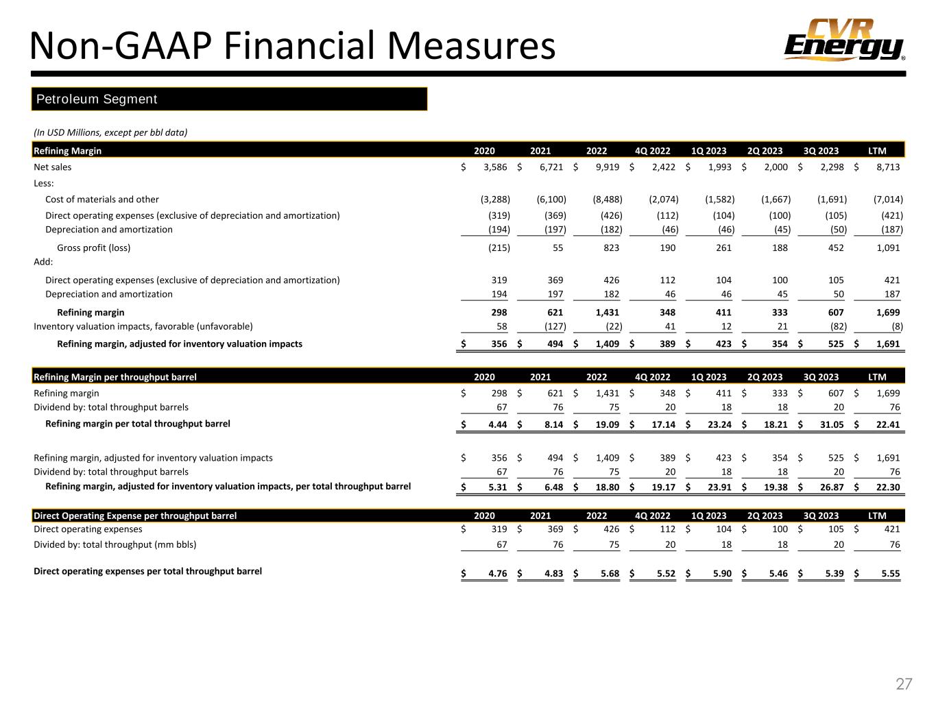 Non-GAAP Financial Measures 26 Note: All amounts on this slide are adjusted for the turnaround accounting change effective in 1Q 2019. These amounts are unaudited. (In USD Millions) CVR Energy, Inc. 2020 2021 2022 4Q 2022 1Q 2023 2Q 2023 3Q 2023 LTM Net Income (loss) (320)$ 74$ 644$ 172$ 259$ 168$ 354$ 953$ Add: Interest expense and other financing costs, net of interest income 130 117 85 18 18 16 11 63 Add: Income tax expense (benefit) (95) (8) 157 50 56 44 84 234 Add: Depreciation and amortization 278 279 288 73 68 72 81 294 EBITDA (7)$ 462$ 1,174$ 313$ 401$ 300$ 530$ 1,544$ Revaluation of RFS liability 59 63 135 26 (56) 2 (174) (202) Gain on marketable securities (34) (81) - - - - - - Unrealized (gain) loss on derivatives 9 (16) 5 10 (31) 19 48 46 Inventory valuation impacts, (favorable) unfavorable 58 (127) (24) 39 20 26 (91) (6) Goodwill impairment 41 - - - - - - - Call Option Lawsuits settlement - - 79 - - - - - Adjusted EBITDA 126$ 301$ 1,369$ 388$ 334$ 347$ 313$ 1,382$