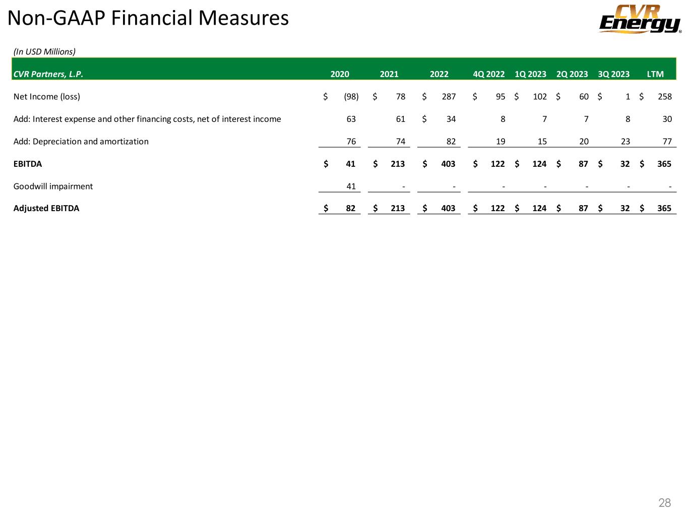 Non-GAAP Financial Measures 28 (In USD Millions) CVR Partners, L.P. 2020 2021 2022 4Q 2022 1Q 2023 2Q 2023 3Q 2023 LTM Net Income (loss) (98)$ 78$ 287$ 95$ 102$ 60$ 1$ 258$ Add: Interest expense and other financing costs, net of interest income 63 61 34$ 8 7 7 8 30 Add: Depreciation and amortization 76 74 82 19 15 20 23 77 EBITDA 41$ 213$ 403$ 122$ 124$ 87$ 32$ 365$ Goodwill impairment 41 - - - - - - - Adjusted EBITDA 82$ 213$ 403$ 122$ 124$ 87$ 32$ 365$