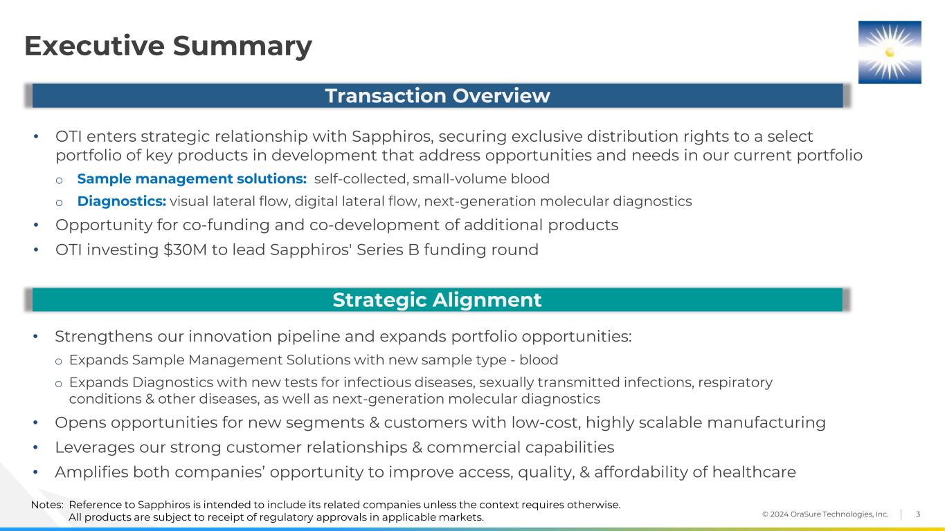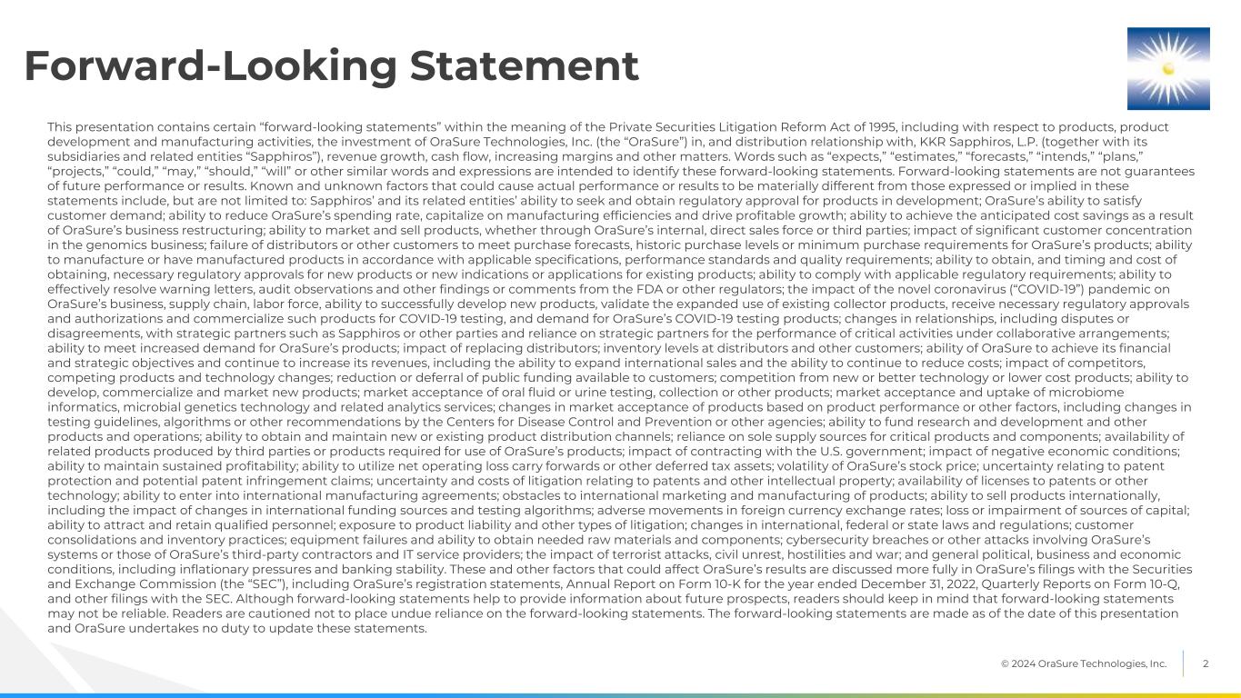 © 2024 OraSure Technologies, Inc. 2 This presentation contains certain “forward-looking statements” within the meaning of the Private Securities Litigation Reform Act of 1995, including with respect to products, product development and manufacturing activities, the investment of OraSure Technologies, Inc. (the “OraSure”) in, and distribution relationship with, KKR Sapphiros, L.P. (together with its subsidiaries and related entities “Sapphiros”), revenue growth, cash flow, increasing margins and other matters. Words such as “expects,” “estimates,” “forecasts,” “intends,” “plans,” “projects,” “could,” “may,” “should,” “will” or other similar words and expressions are intended to identify these forward-looking statements. Forward-looking statements are not guarantees of future performance or results. Known and unknown factors that could cause actual performance or results to be materially different from those expressed or implied in these statements include, but are not limited to: Sapphiros’ and its related entities’ ability to seek and obtain regulatory approval for products in development; OraSure’s ability to satisfy customer demand; ability to reduce OraSure’s spending rate, capitalize on manufacturing efficiencies and drive profitable growth; ability to achieve the anticipated cost savings as a result of OraSure’s business restructuring; ability to market and sell products, whether through OraSure’s internal, direct sales force or third parties; impact of significant customer concentration in the genomics business; failure of distributors or other customers to meet purchase forecasts, historic purchase levels or minimum purchase requirements for OraSure’s products; ability to manufacture or have manufactured products in accordance with applicable specifications, performance standards and quality requirements; ability to obtain, and timing and cost of obtaining, necessary regulatory approvals for new products or new indications or applications for existing products; ability to comply with applicable regulatory requirements; ability to effectively resolve warning letters, audit observations and other findings or comments from the FDA or other regulators; the impact of the novel coronavirus (“COVID-19”) pandemic on OraSure’s business, supply chain, labor force, ability to successfully develop new products, validate the expanded use of existing collector products, receive necessary regulatory approvals and authorizations and commercialize such products for COVID-19 testing, and demand for OraSure’s COVID-19 testing products; changes in relationships, including disputes or disagreements, with strategic partners such as Sapphiros or other parties and reliance on strategic partners for the performance of critical activities under collaborative arrangements; ability to meet increased demand for OraSure’s products; impact of replacing distributors; inventory levels at distributors and other customers; ability of OraSure to achieve its financial and strategic objectives and continue to increase its revenues, including the ability to expand international sales and the ability to continue to reduce costs; impact of competitors, competing products and technology changes; reduction or deferral of public funding available to customers; competition from new or better technology or lower cost products; ability to develop, commercialize and market new products; market acceptance of oral fluid or urine testing, collection or other products; market acceptance and uptake of microbiome informatics, microbial genetics technology and related analytics services; changes in market acceptance of products based on product performance or other factors, including changes in testing guidelines, algorithms or other recommendations by the Centers for Disease Control and Prevention or other agencies; ability to fund research and development and other products and operations; ability to obtain and maintain new or existing product distribution channels; reliance on sole supply sources for critical products and components; availability of related products produced by third parties or products required for use of OraSure’s products; impact of contracting with the U.S. government; impact of negative economic conditions; ability to maintain sustained profitability; ability to utilize net operating loss carry forwards or other deferred tax assets; volatility of OraSure’s stock price; uncertainty relating to patent protection and potential patent infringement claims; uncertainty and costs of litigation relating to patents and other intellectual property; availability of licenses to patents or other technology; ability to enter into international manufacturing agreements; obstacles to international marketing and manufacturing of products; ability to sell products internationally, including the impact of changes in international funding sources and testing algorithms; adverse movements in foreign currency exchange rates; loss or impairment of sources of capital; ability to attract and retain qualified personnel; exposure to product liability and other types of litigation; changes in international, federal or state laws and regulations; customer consolidations and inventory practices; equipment failures and ability to obtain needed raw materials and components; cybersecurity breaches or other attacks involving OraSure’s systems or those of OraSure’s third-party contractors and IT service providers; the impact of terrorist attacks, civil unrest, hostilities and war; and general political, business and economic conditions, including inflationary pressures and banking stability. These and other factors that could affect OraSure’s results are discussed more fully in OraSure’s filings with the Securities and Exchange Commission (the “SEC”), including OraSure’s registration statements, Annual Report on Form 10-K for the year ended December 3