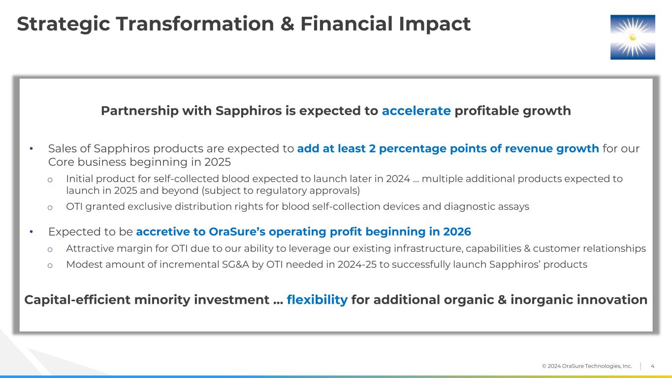 © 2024 OraSure Technologies, Inc. 3 Executive Summary Strategic Alignment • OTI enters strategic relationship with Sapphiros, securing exclusive distribution rights to a select portfolio of key products in development that address opportunities and needs in our current portfolio o Sample management solutions: self-collected, small-volume blood o Diagnostics: visual lateral flow, digital lateral flow, next-generation molecular diagnostics • Opportunity for co-funding and co-development of additional products • OTI investing $30M to lead Sapphiros' Series B funding round Transaction Overview • Strengthens our innovation pipeline and expands portfolio opportunities: o Expands Sample Management Solutions with new sample type - blood o Expands Diagnostics with new tests for infectious diseases, sexually transmitted infections, respiratory conditions & other diseases, as well as next-generation molecular diagnostics • Opens opportunities for new segments & customers with low-cost, highly scalable manufacturing • Leverages our strong customer relationships & commercial capabilities • Amplifies both companies’ opportunity to improve access, quality, & affordability of healthcare Notes: Reference to Sapphiros is intended to include its related companies unless the context requires otherwise. All products are subject to receipt of regulatory approvals in applicable markets.