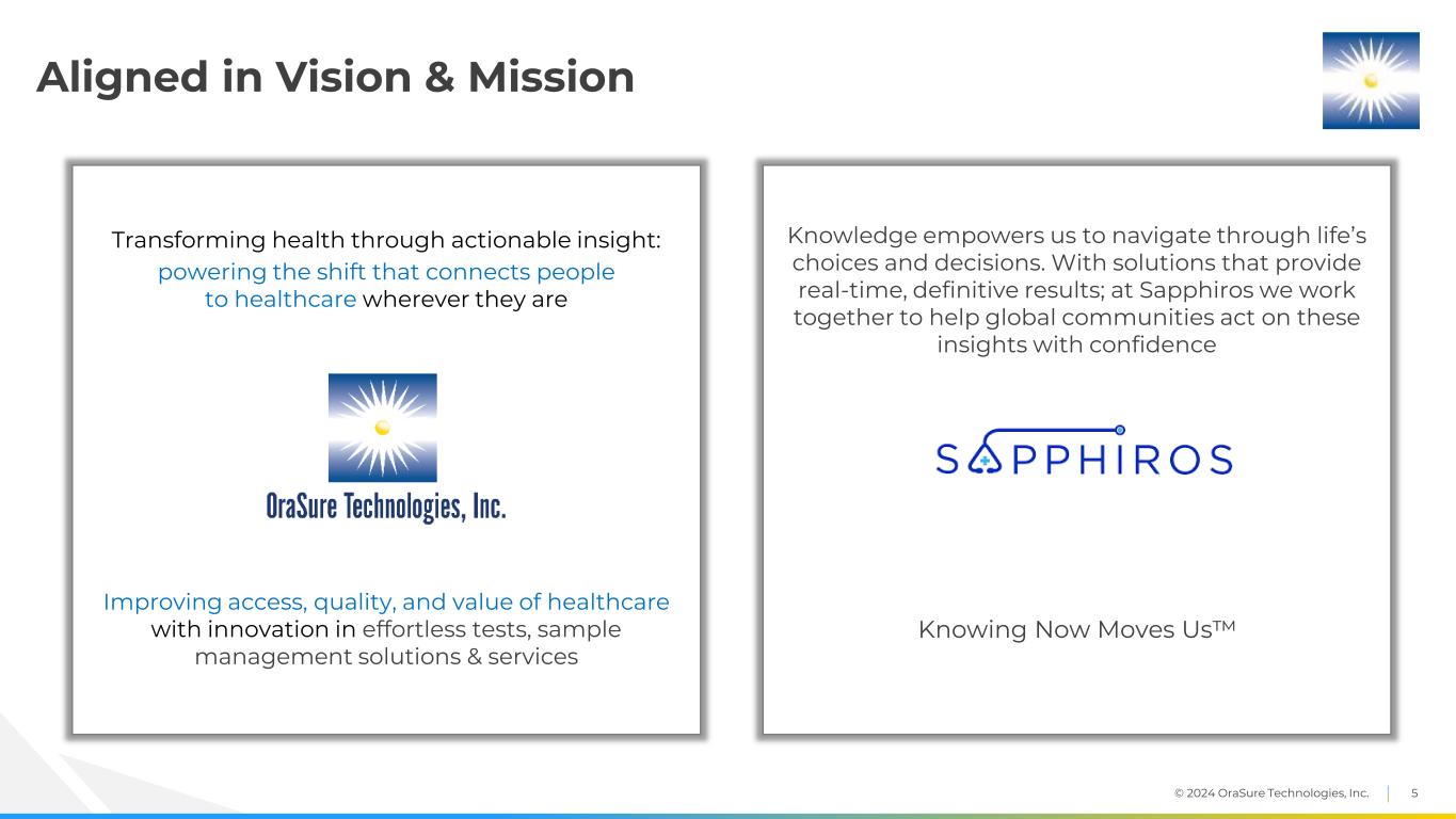 © 2024 OraSure Technologies, Inc. 4 Strategic Transformation & Financial Impact Partnership with Sapphiros is expected to accelerate profitable growth • Sales of Sapphiros products are expected to add at least 2 percentage points of revenue growth for our Core business beginning in 2025 o Initial product for self-collected blood expected to launch later in 2024 … multiple additional products expected to launch in 2025 and beyond (subject to regulatory approvals) o OTI granted exclusive distribution rights for blood self-collection devices and diagnostic assays • Expected to be accretive to OraSure’s operating profit beginning in 2026 o Attractive margin for OTI due to our ability to leverage our existing infrastructure, capabilities & customer relationships o Modest amount of incremental SG&A by OTI needed in 2024-25 to successfully launch Sapphiros’ products Capital-efficient minority investment … flexibility for additional organic & inorganic innovation