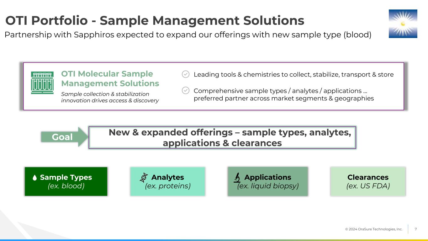 © 2024 OraSure Technologies, Inc. 6 Move to Point-of-Care & Home Testing Growth of Precision Medicine Healthcare Consumerism OraSure’s Imperatives Shared Focus on the Future of Healthcare