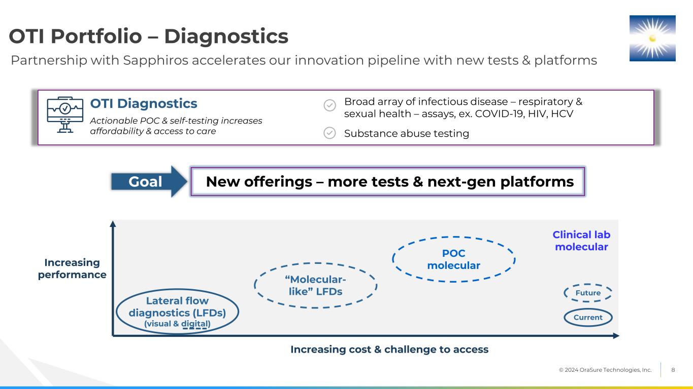 © 2024 OraSure Technologies, Inc. 7 Analytes (ex. proteins) Sample Types (ex. blood) Partnership with Sapphiros expected to expand our offerings with new sample type (blood) New & expanded offerings – sample types, analytes, applications & clearances Leading tools & chemistries to collect, stabilize, transport & store Comprehensive sample types / analytes / applications … preferred partner across market segments & geographies OTI Molecular Sample Management Solutions Sample collection & stabilization innovation drives access & discovery Applications (ex. liquid biopsy) OTI Portfolio - Sample Management Solutions Goal Clearances (ex. US FDA)