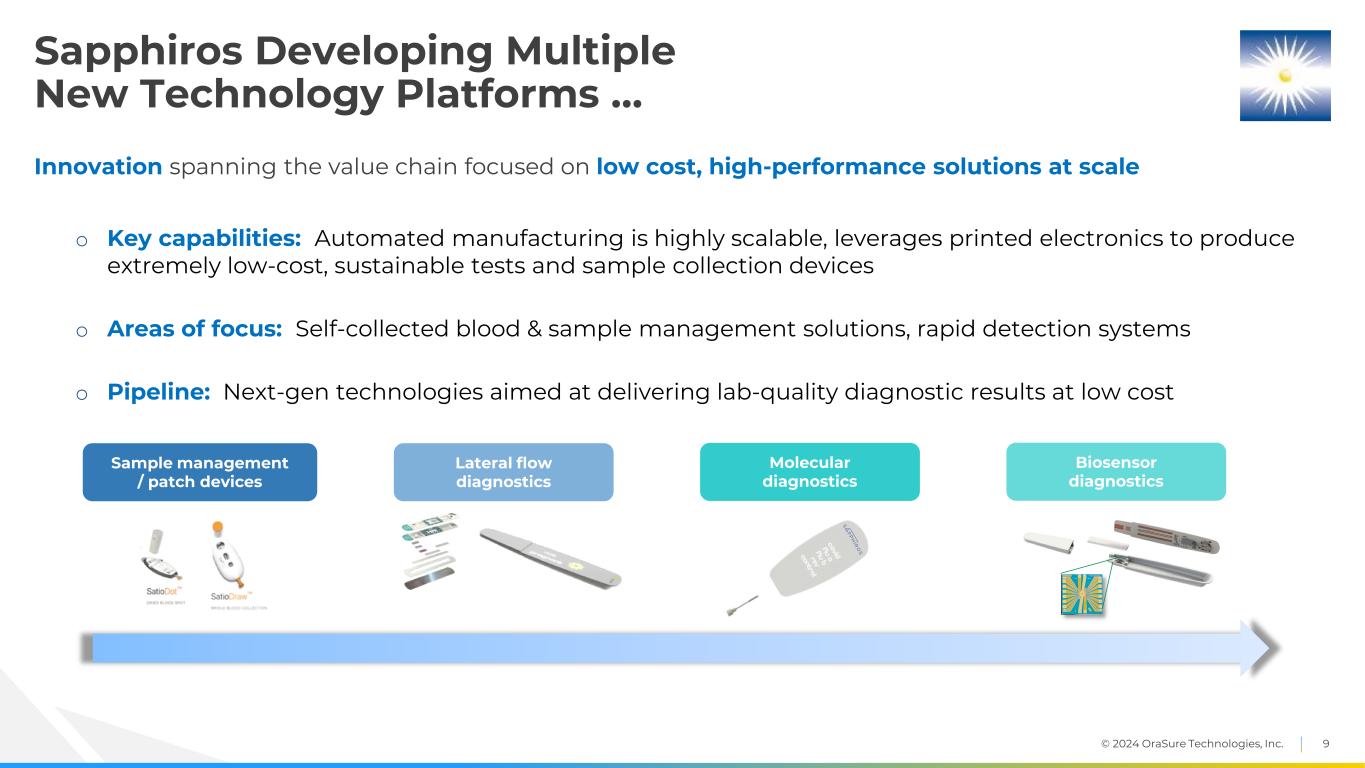 © 2024 OraSure Technologies, Inc. 8 OTI Portfolio – Diagnostics Broad array of infectious disease – respiratory & sexual health – assays, ex. COVID-19, HIV, HCV Substance abuse testing OTI Diagnostics Actionable POC & self-testing increases affordability & access to care Clinical lab molecular Increasing performance Increasing cost & challenge to access “Molecular- like” LFDs Lateral flow diagnostics (LFDs) (visual & digital) POC molecular Partnership with Sapphiros accelerates our innovation pipeline with new tests & platforms New offerings – more tests & next-gen platformsGoal Current Future