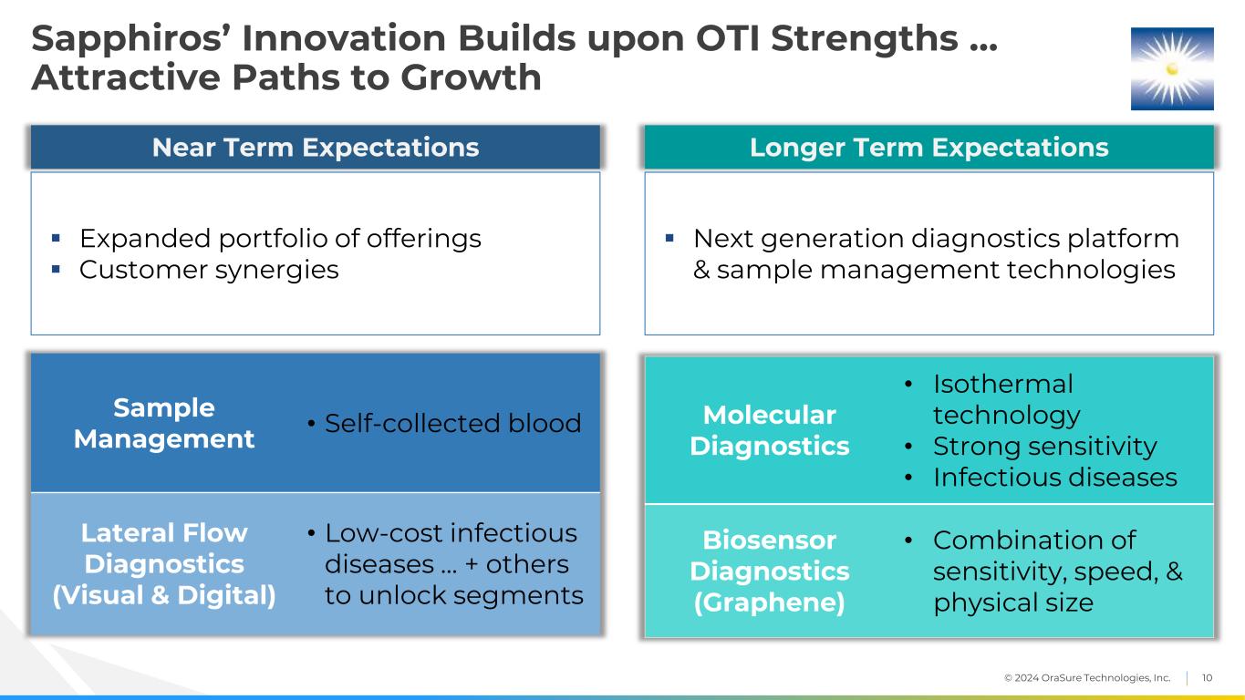 © 2024 OraSure Technologies, Inc. 9 Sapphiros Developing Multiple New Technology Platforms … Innovation spanning the value chain focused on low cost, high-performance solutions at scale o Key capabilities: Automated manufacturing is highly scalable, leverages printed electronics to produce extremely low-cost, sustainable tests and sample collection devices o Areas of focus: Self-collected blood & sample management solutions, rapid detection systems o Pipeline: Next-gen technologies aimed at delivering lab-quality diagnostic results at low cost Lateral flow diagnostics Sample management / patch devices Molecular diagnostics Biosensor diagnostics