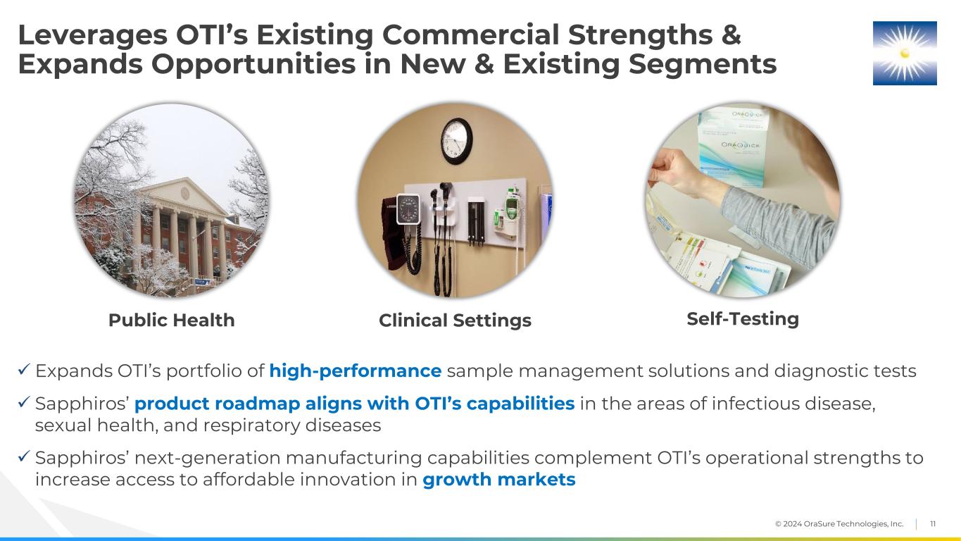 © 2024 OraSure Technologies, Inc. 10 Sapphiros’ Innovation Builds upon OTI Strengths … Attractive Paths to Growth Sample Management • Self-collected blood Lateral Flow Diagnostics (Visual & Digital) • Low-cost infectious diseases … + others to unlock segments Expanded portfolio of offerings Customer synergies Near Term Expectations Next generation diagnostics platform & sample management technologies Longer Term Expectations Molecular Diagnostics • Isothermal technology • Strong sensitivity • Infectious diseases Biosensor Diagnostics (Graphene) • Combination of sensitivity, speed, & physical size