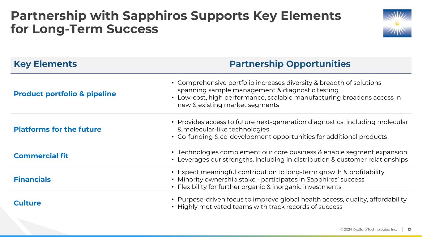 © 2024 OraSure Technologies, Inc. 11 Public Health Clinical Settings Self-Testing OraSure’s ImperativesLeverages OTI’s Existing Commercial Strengths & Expands Opportunities in New & Existing Segments Expands OTI’s portfolio of high-performance sample management solutions and diagnostic tests Sapphiros’ product roadmap aligns with OTI’s capabilities in the areas of infectious disease, sexual health, and respiratory diseases Sapphiros’ next-generation manufacturing capabilities complement OTI’s operational strengths to increase access to affordable innovation in growth markets