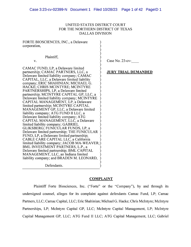 This Amendment No. 1 (this “Amendment”) amends and supplements the Schedule 13D filed on August 23, 2023, with the Securities and Exchange Commission, by the Reporting Person (defined below) with respect to the Common Stock of Forte Biosciences Inc. (the “Issuer” or the “Company”). Information reported in the Schedule 13D remains in effect except to the extent that it is amended, restated or superseded by information contained in this Amendment. Capitalized terms used but not defined in this Amendment have the respective meanings set forth in the Schedule 13D. All references in the Schedule 13D and this Amendment to the “Statement” will be deemed to refer to the Schedule 13D as amended and supplemented by this Amendment.
