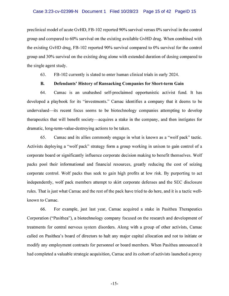 On September 7, 2023, the parties agreed to a case schedule that would allow the parties to learn the results of the Issuer’s 2023 annual meeting prior to further litigation, which was granted by the Chancery Court on September 8, 2023. Camac Fund also agreed to dismiss, without prejudice, the following defendants: Fred Alger Management, LLC, BVF Partners L.P., Farallon Capital Management, L.L.C., Perceptive Advisors LLC, and Tybourne Capital (US) LLC.
