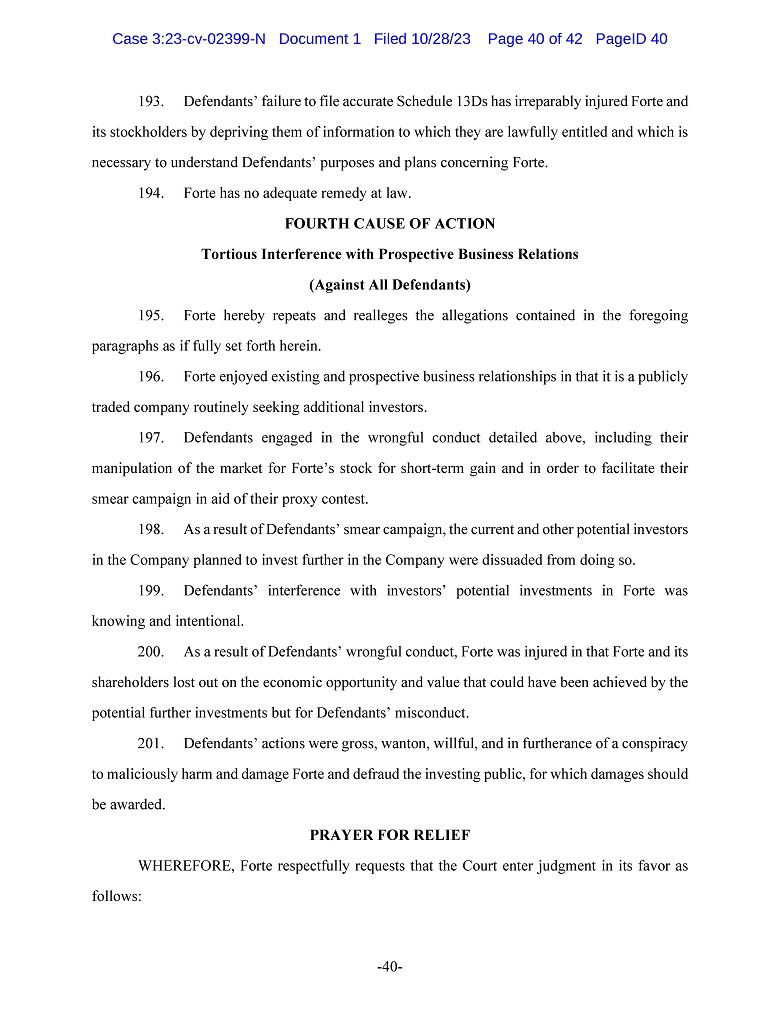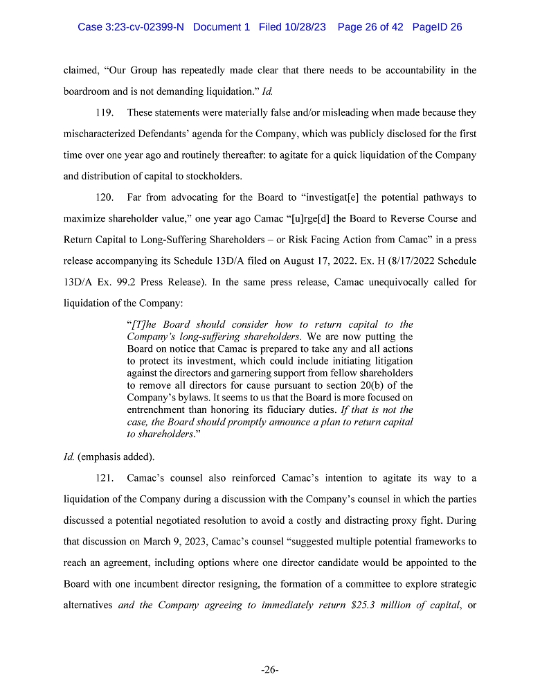 On October 28, 2023, the Issuer filed an action against the Reporting Persons and certain other defendants in the U.S. District Court for the Northern District of Texas (the “Texas Action”). The Texas Action alleges, among other things, that the Reporting Persons and other defendants were allegedly part of an undisclosed group formed to advocate for liquidation and/or other change of the Issuer. The Texas Action asserts purported (i) violations Section 14(a) of the Exchange Act and Rule 14a-9 promulgated thereunder; (ii) violations of Section 13(d) of the Exchange Act; and (iii) tortious interference. The foregoing description of the Texas Action is qualified in its entirety by reference to the Complaint, which is attached in its entirety as Exhibit 99.3 hereto and incorporated by reference herein.