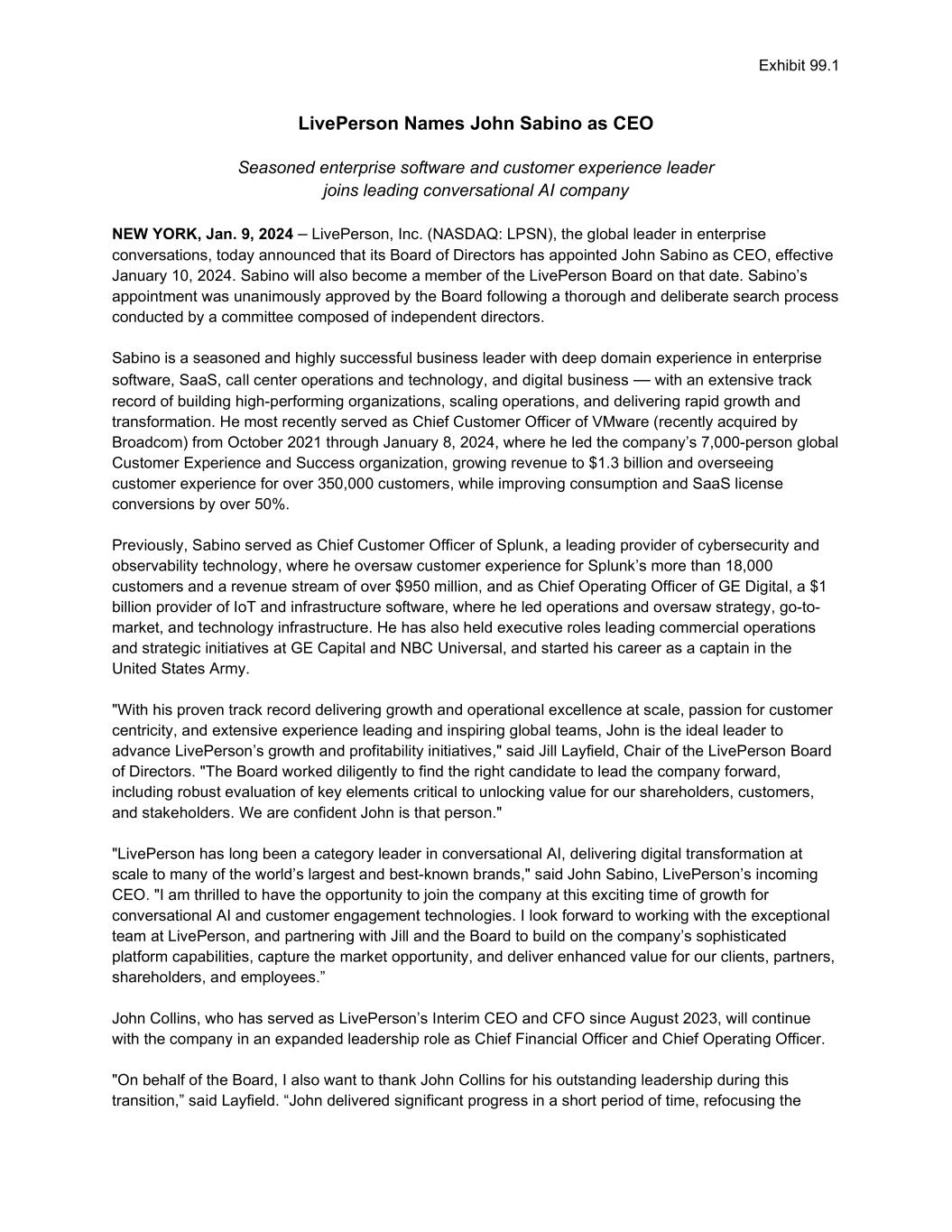 Exhibit 99.1 LivePerson Names John Sabino as CEO Seasoned enterprise software and customer experience leader joins leading conversational AI company NEW YORK, Jan. 9, 2024 – LivePerson, Inc. (NASDAQ: LPSN), the global leader in enterprise conversations, today announced that its Board of Directors has appointed John Sabino as CEO, effective January 10, 2024. Sabino will also become a member of the LivePerson Board on that date. Sabino’s appointment was unanimously approved by the Board following a thorough and deliberate search process conducted by a committee composed of independent directors. Sabino is a seasoned and highly successful business leader with deep domain experience in enterprise software, SaaS, call center operations and technology, and digital business — with an extensive track record of building high-performing organizations, scaling operations, and delivering rapid growth and transformation. He most recently served as Chief Customer Officer of VMware (recently acquired by Broadcom) from October 2021 through January 8, 2024, where he led the company’s 7,000-person global Customer Experience and Success organization, growing revenue to $1.3 billion and overseeing customer experience for over 350,000 customers, while improving consumption and SaaS license conversions by over 50%. Previously, Sabino served as Chief Customer Officer of Splunk, a leading provider of cybersecurity and observability technology, where he oversaw customer experience for Splunk’s more than 18,000 customers and a revenue stream of over $950 million, and as Chief Operating Officer of GE Digital, a $1 billion provider of IoT and infrastructure software, where he led operations and oversaw strategy, go-to- market, and technology infrastructure. He has also held executive roles leading commercial operations and strategic initiatives at GE Capital and NBC Universal, and started his career as a captain in the United States Army. "With his proven track record delivering growth and operational excellence at scale, passion for customer centricity, and extensive experience leading and inspiring global teams, John is the ideal leader to advance LivePerson’s growth and profitability initiatives," said Jill Layfield, Chair of the LivePerson Board of Directors. "The Board worked diligently to find the right candidate to lead the company forward, including robust evaluation of key elements critical to unlocking value for our shareholders, customers, and stakeholders. We are confident John is that person." "LivePerson has long been a category leader in conversational AI, delivering digital transformation at scale to many of the world’s largest and best-known brands," said John Sabino, LivePerson’s incoming CEO. "I am thrilled to have the opportunity to join the company at this exciting time of growth for conversational AI and customer engagement technologies. I look forward to working with the exceptional team at LivePerson, and partnering with Jill and the Board to build on the company’s sophisticated platform capabilities, capture the market opportunity, and deliver enhanced value for our clients, partners, shareholders, and employees.” John Collins, who has served as LivePerson’s Interim CEO and CFO since August 2023, will continue with the company in an expanded leadership role as Chief Financial Officer and Chief Operating Officer. "On behalf of the Board, I also want to thank John Collins for his outstanding leadership during this transition,” said Layfield. “John delivered significant progress in a short period of time, refocusing the
