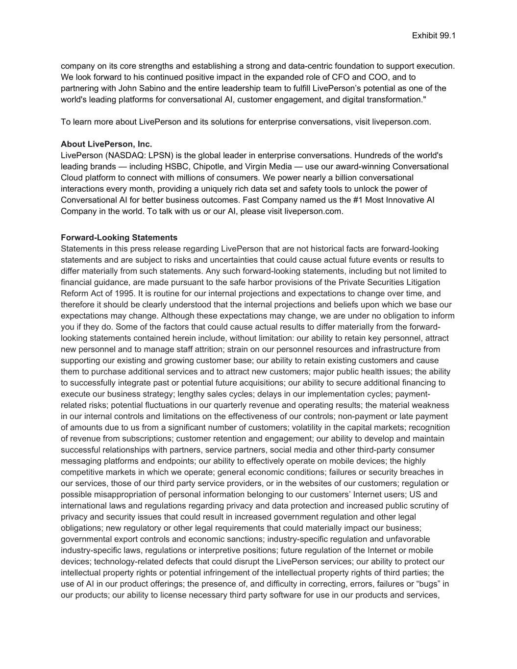 Exhibit 99.1 company on its core strengths and establishing a strong and data-centric foundation to support execution. We look forward to his continued positive impact in the expanded role of CFO and COO, and to partnering with John Sabino and the entire leadership team to fulfill LivePerson’s potential as one of the world's leading platforms for conversational AI, customer engagement, and digital transformation." To learn more about LivePerson and its solutions for enterprise conversations, visit liveperson.com. About LivePerson, Inc. LivePerson (NASDAQ: LPSN) is the global leader in enterprise conversations. Hundreds of the world's leading brands — including HSBC, Chipotle, and Virgin Media — use our award-winning Conversational Cloud platform to connect with millions of consumers. We power nearly a billion conversational interactions every month, providing a uniquely rich data set and safety tools to unlock the power of Conversational AI for better business outcomes. Fast Company named us the #1 Most Innovative AI Company in the world. To talk with us or our AI, please visit liveperson.com. Forward-Looking Statements Statements in this press release regarding LivePerson that are not historical facts are forward-looking statements and are subject to risks and uncertainties that could cause actual future events or results to differ materially from such statements. Any such forward-looking statements, including but not limited to financial guidance, are made pursuant to the safe harbor provisions of the Private Securities Litigation Reform Act of 1995. It is routine for our internal projections and expectations to change over time, and therefore it should be clearly understood that the internal projections and beliefs upon which we base our expectations may change. Although these expectations may change, we are under no obligation to inform you if they do. Some of the factors that could cause actual results to differ materially from the forward- looking statements contained herein include, without limitation: our ability to retain key personnel, attract new personnel and to manage staff attrition; strain on our personnel resources and infrastructure from supporting our existing and growing customer base; our ability to retain existing customers and cause them to purchase additional services and to attract new customers; major public health issues; the ability to successfully integrate past or potential future acquisitions; our ability to secure additional financing to execute our business strategy; lengthy sales cycles; delays in our implementation cycles; payment- related risks; potential fluctuations in our quarterly revenue and operating results; the material weakness in our internal controls and limitations on the effectiveness of our controls; non-payment or late payment of amounts due to us from a significant number of customers; volatility in the capital markets; recognition of revenue from subscriptions; customer retention and engagement; our ability to develop and maintain successful relationships with partners, service partners, social media and other third-party consumer messaging platforms and endpoints; our ability to effectively operate on mobile devices; the highly competitive markets in which we operate; general economic conditions; failures or security breaches in our services, those of our third party service providers, or in the websites of our customers; regulation or possible misappropriation of personal information belonging to our customers’ Internet users; US and international laws and regulations regarding privacy and data protection and increased public scrutiny of privacy and security issues that could result in increased government regulation and other legal obligations; new regulatory or other legal requirements that could materially impact our business; governmental export controls and economic sanctions; industry-specific regulation and unfavorable industry-specific laws, regulations or interpretive positions; future regulation of the Internet or mobile devices; technology-related defects that could disrupt the LivePerson services; our ability to protect our intellectual property rights or potential infringement of the intellectual property rights of third parties; the use of AI in our product offerings; the presence of, and difficulty in correcting, errors, failures or “bugs” in our products; our ability to license necessary third party software for use in our products and services,