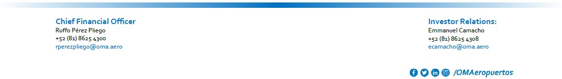 Grupo Aeroportuario del Centro Norte, S.A.B. de C.V., known as OMA, operates 13 international airports in nine states of central and northern Mexico. OMA’s airports serve Monterrey, Mexico’s third largest metropolitan area, the tourist destinations of Acapulco, Mazatlán, and Zihuatanejo, and nine other regional centers and border cities. OMA also operates the NH Collection Hotel inside Terminal 2 of the Mexico City airport and the Hilton Garden Inn at the Monterrey airport. OMA employs over 1,200 persons in order to offer passengers and clients airport and commercial services in facilities. OMA is listed on the Mexican Stock Exchange (OMA) and on the NASDAQ Global Select Market (OMAB). For more information, visit: