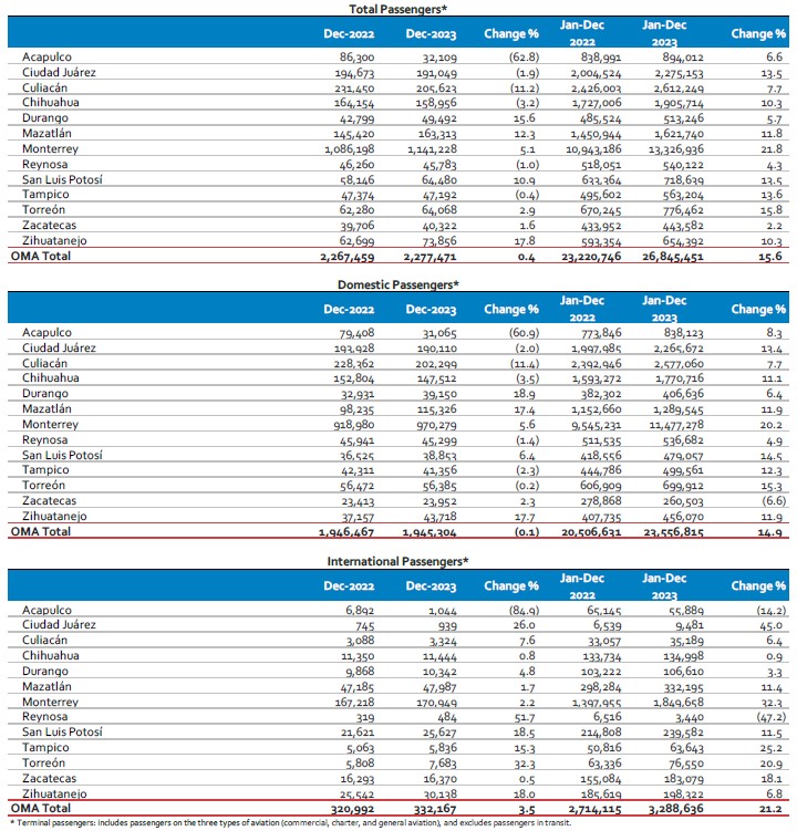 Mexico City, Mexico, January 8, 2024—Mexican airport operator Grupo Aeroportuario del Centro Norte, S.A.B. de C.V., known as OMA (NASDAQ: OMAB; BMV: OMA), reports that terminal passenger traffic at its 13 airports increased 0.4% in December 2023, as compared to December 2022. Domestic traffic decreased -0.1%, and international traffic increased 3.5%. During December, Acapulco Airport operated in a regular manner, the figures reflect the impact of Hurricane Otis on the destination. Excluding Acapulco Airport, terminal passenger traffic in its remaining 12 airports increased 2.9% during December 2023, as compared to December 2022.