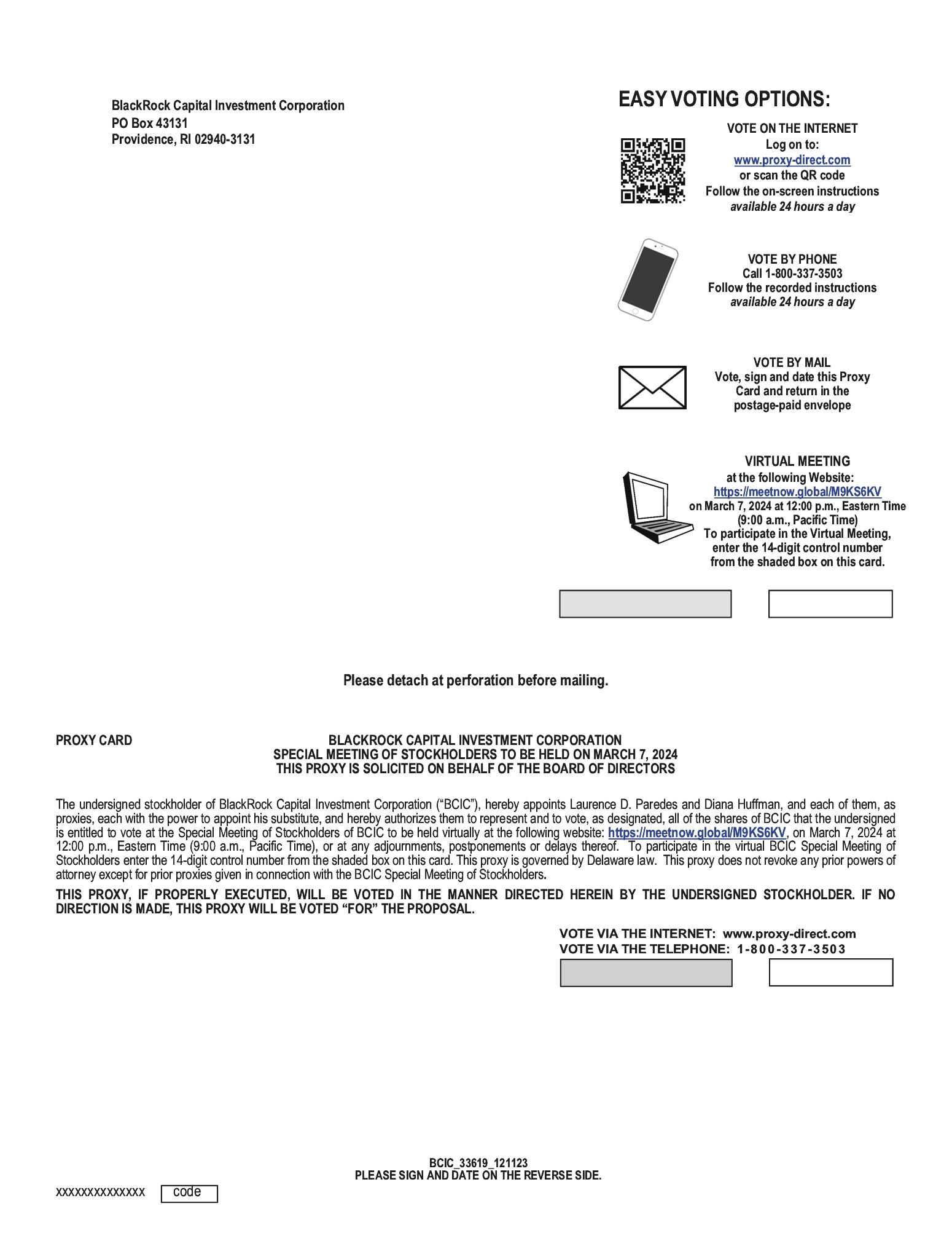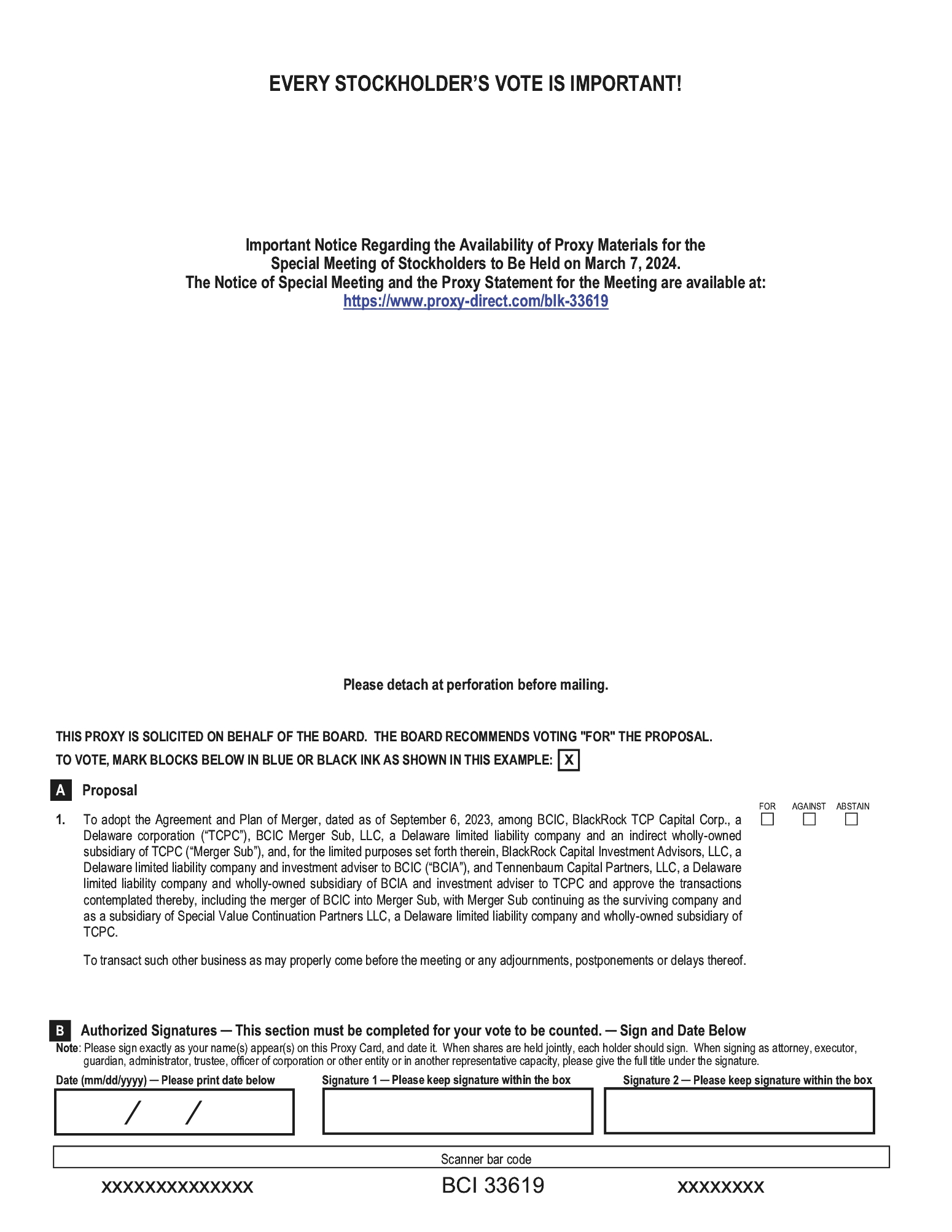 “Takeover Proposal” means any inquiry, proposal, discussions, negotiations or offer from any Person or group of Persons (other than TCPC or BCIC or any of their respective Affiliates) (a) with respect to a merger, consolidation, tender offer, exchange offer, stock acquisition, asset acquisition, share exchange, business combination, recapitalization, liquidation, dissolution, joint venture or similar transaction involving BCIC or TCPC, as applicable, or any of such party’s respective Consolidated Subsidiaries, as applicable, or (b) relating to any direct or indirect acquisition, in one transaction or a series of transactions, of (i) assets or businesses (including any mortgage, pledge or similar disposition thereof but excluding any bona fide financing transaction) that constitute or represent, or would constitute or represent if such transaction is consummated, 25% or more of the total assets, net revenue or net income of BCIC or TCPC, as applicable, and such party’s respective Consolidated Subsidiaries, taken as a whole, or (ii) 25% or more of the outstanding shares of capital stock of, or other equity or voting interests in, BCIC or in any of BCIC’s Consolidated Subsidiaries or, TCPC or in any of TCPC’s Consolidated Subsidiaries, as applicable, in each case other than the Merger and the other Transactions.