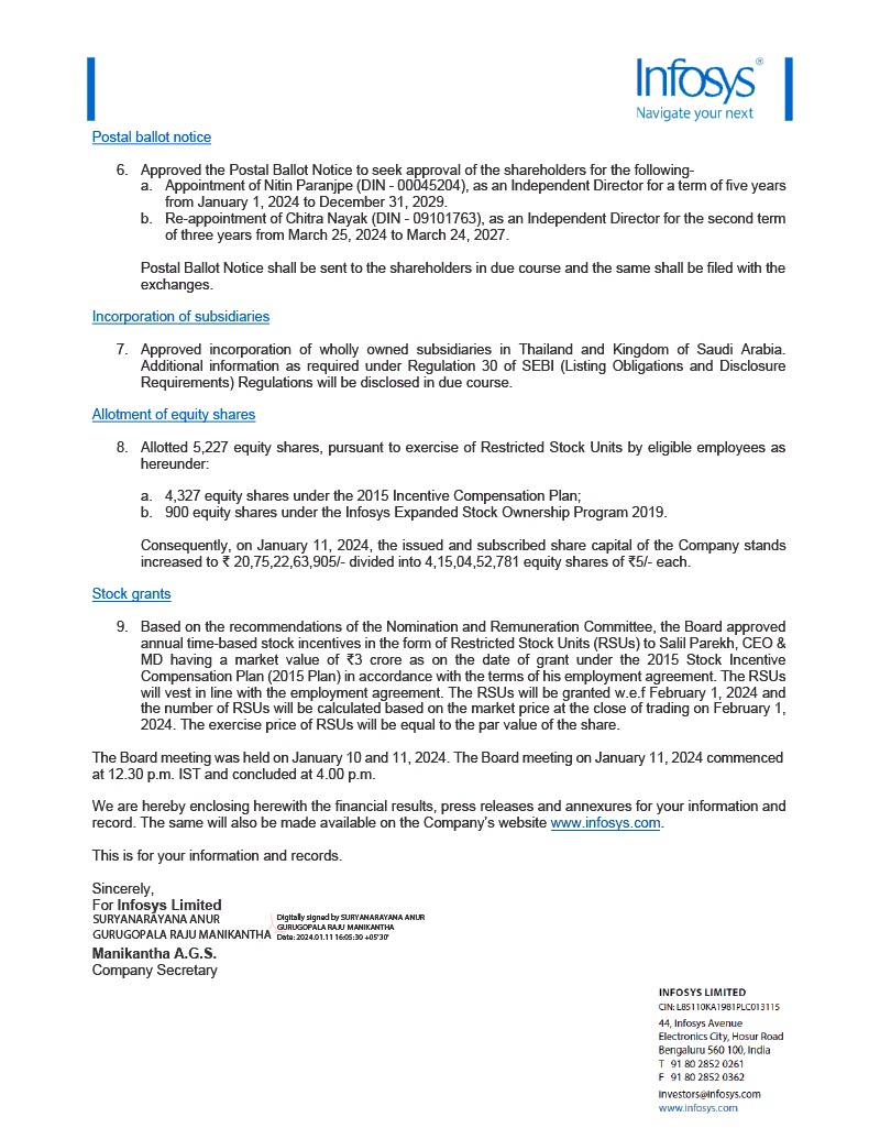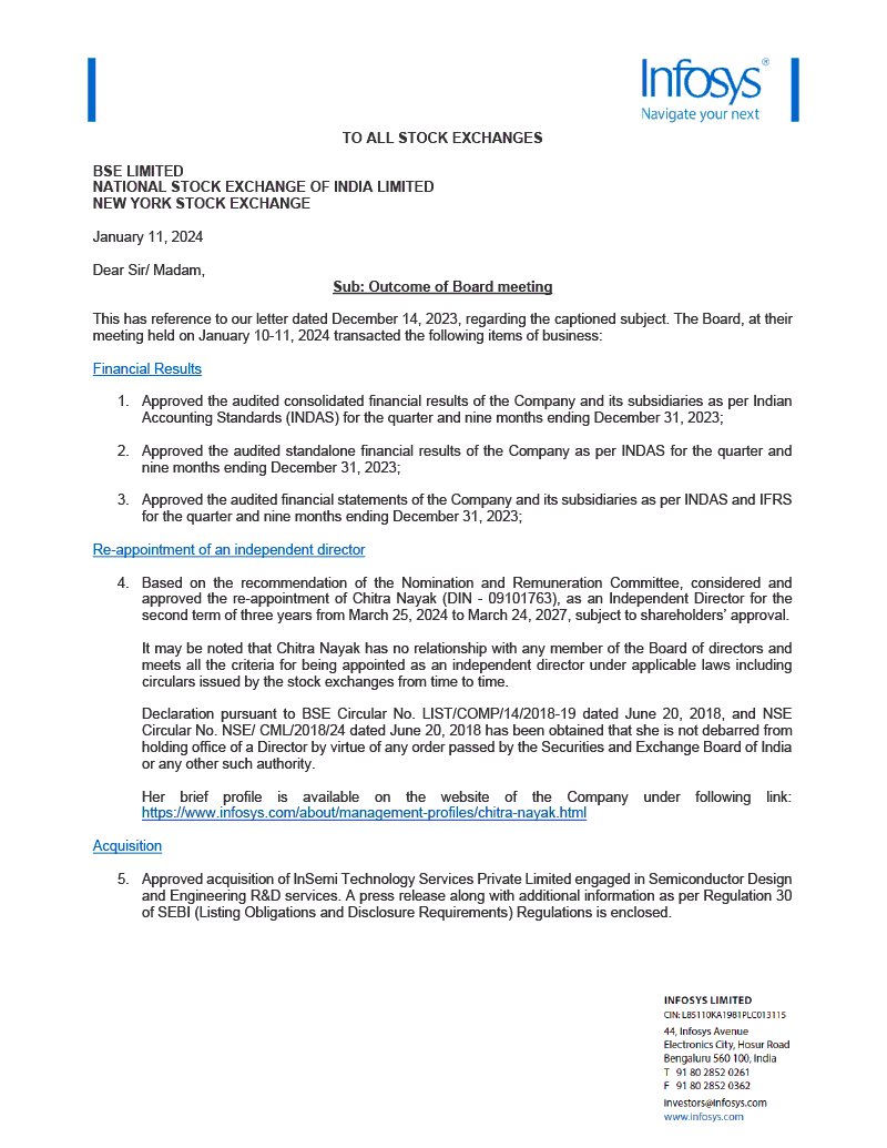 Infosys Limited (“we” or “the Company”) hereby furnishes the United States Securities and Exchange Commission with copies of the following information concerning our public disclosures regarding our results of operations and financial condition for the quarter ended December 31, 2023.