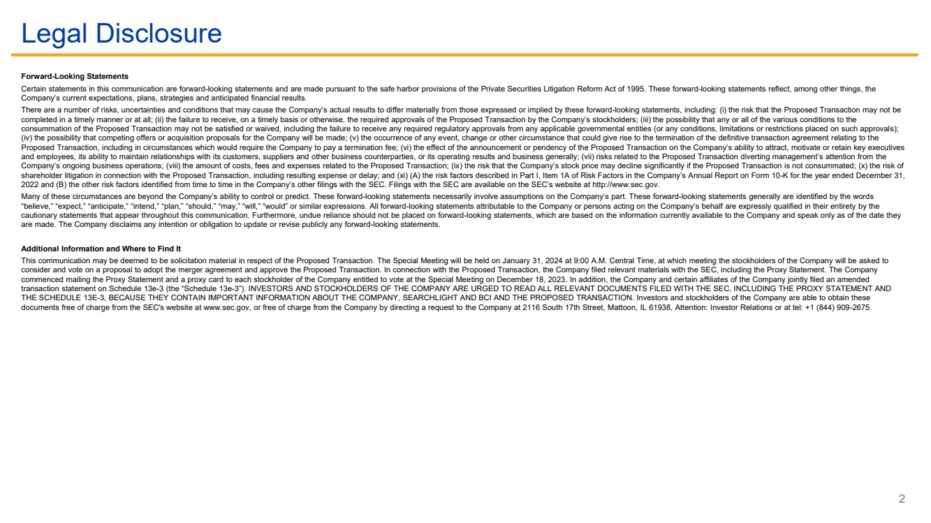 | 2 Legal Disclosure Forward-Looking Statements Certain statements in this communication are forward-looking statements and are made pursuant to the safe harbor provisions of the Private Securities Litigation Reform Act of 1995. These forward-looking statements reflect, among other things, the Company’s current expectations, plans, strategies and anticipated financial results. There are a number of risks, uncertainties and conditions that may cause the Company’s actual results to differ materially from those expressed or implied by these forward-looking statements, including: (i) the risk that the Proposed Transaction may not be completed in a timely manner or at all; (ii) the failure to receive, on a timely basis or otherwise, the required approvals of the Proposed Transaction by the Company’s stockholders; (iii) the possibility that any or all of the various conditions to the consummation of the Proposed Transaction may not be satisfied or waived, including the failure to receive any required regulatory approvals from any applicable governmental entities (or any conditions, limitations or restrictions placed on such approvals); (iv) the possibility that competing offers or acquisition proposals for the Company will be made; (v) the occurrence of any event, change or other circumstance that could give rise to the termination of the definitive transaction agreement relating to the Proposed Transaction, including in circumstances which would require the Company to pay a termination fee; (vi) the effect of the announcement or pendency of the Proposed Transaction on the Company’s ability to attract, motivate or retain key executives and employees, its ability to maintain relationships with its customers, suppliers and other business counterparties, or its operating results and business generally; (vii) risks related to the Proposed Transaction diverting management’s attention from the Company’s ongoing business operations; (viii) the amount of costs, fees and expenses related to the Proposed Transaction; (ix) the risk that the Company’s stock price may decline significantly if the Proposed Transaction is not consummated; (x) the risk of shareholder litigation in connection with the Proposed Transaction, including resulting expense or delay; and (xi) (A) the risk factors described in Part I, Item 1A of Risk Factors in the Company’s Annual Report on Form 10-K for the year ended December 31, 2022 and (B) the other risk factors identified from time to time in the Company’s other filings with the SEC. Filings with the SEC are available on the SEC’s website at http://www.sec.gov. Many of these circumstances are beyond the Company’s ability to control or predict. These forward-looking statements necessarily involve assumptions on the Company’s part. These forward-looking statements generally are identified by the words “believe,” “expect,” “anticipate,” “intend,” “plan,” “should,” “may,” “will,” “would” or similar expressions. All forward-looking statements attributable to the Company or persons acting on the Company’s behalf are expressly qualified in their entirety by the cautionary statements that appear throughout this communication. Furthermore, undue reliance should not be placed on forward-looking statements, which are based on the information currently available to the Company and speak only as of the date they are made. The Company disclaims any intention or obligation to update or revise publicly any forward-looking statements. Additional Information and Where to Find It This communication may be deemed to be solicitation material in respect of the Proposed Transaction. The Special Meeting will be held on January 31, 2024 at 9:00 A.M. Central Time, at which meeting the stockholders of the Company will be asked to consider and vote on a proposal to adopt the merger agreement and approve the Proposed Transaction. In connection with the Proposed Transaction, the Company filed relevant materials with the SEC, including the Proxy Statement. The Company commenced mailing the Proxy Statement and a proxy card to each stockholder of the Company entitled to vote at the Special Meeting on December 18, 2023. In addition, the Company and certain affiliates of the Company jointly filed an amended transaction statement on Schedule 13e-3 (the “Schedule 13e-3”). INVESTORS AND STOCKHOLDERS OF THE COMPANY ARE URGED TO READ ALL RELEVANT DOCUMENTS FILED WITH THE SEC, INCLUDING THE PROXY STATEMENT AND THE SCHEDULE 13E-3, BECAUSE THEY CONTAIN IMPORTANT INFORMATION ABOUT THE COMPANY, SEARCHLIGHT AND BCI AND THE PROPOSED TRANSACTION. Investors and stockholders of the Company are able to obtain these documents free of charge from the SEC's website at www.sec.gov, or free of charge from the Company by directing a request to the Company at 2116 South 17th Street, Mattoon, IL 61938, Attention: Investor Relations or at tel: +1 (844) 909-2675. |