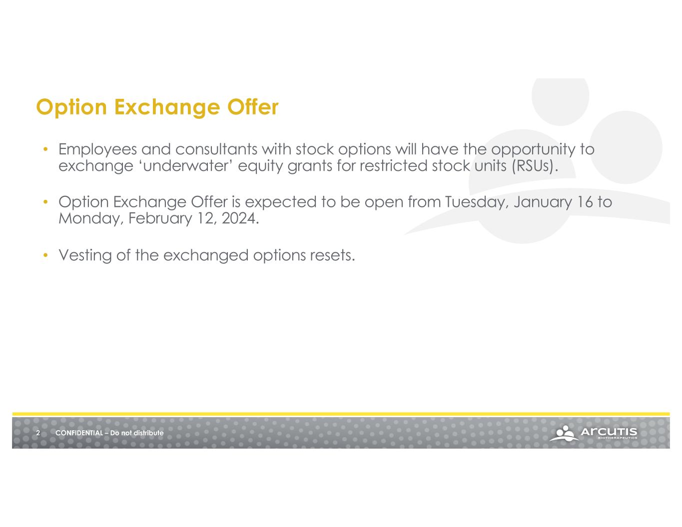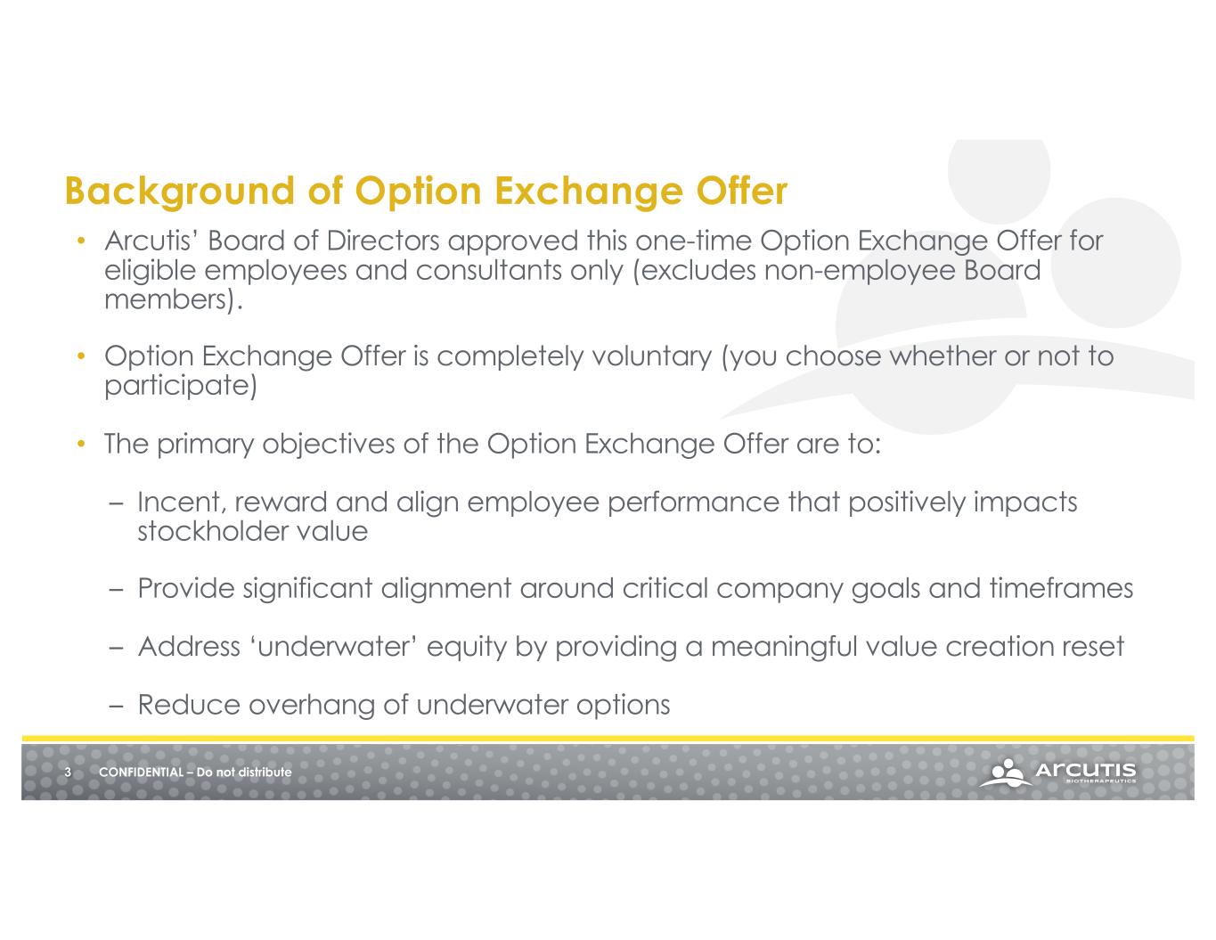 • Employees and consultants with stock options will have the opportunity to exchange ‘underwater’ equity grants for restricted stock units (RSUs). • Option Exchange Offer is expected to be open from Tuesday, January 16 to Monday, February 12, 2024. • Vesting of the exchanged options resets. 2 CONFIDENTIAL – Do not distribute Option Exchange Offer