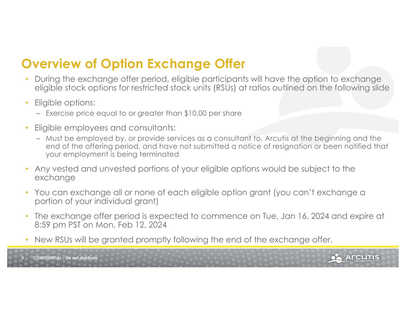 • Arcutis’ Board of Directors approved this one-time Option Exchange Offer for eligible employees and consultants only (excludes non-employee Board members). • Option Exchange Offer is completely voluntary (you choose whether or not to participate) • The primary objectives of the Option Exchange Offer are to: – Incent, reward and align employee performance that positively impacts stockholder value – Provide significant alignment around critical company goals and timeframes – Address ‘underwater’ equity by providing a meaningful value creation reset – Reduce overhang of underwater options 3 CONFIDENTIAL – Do not distribute Background of Option Exchange Offer