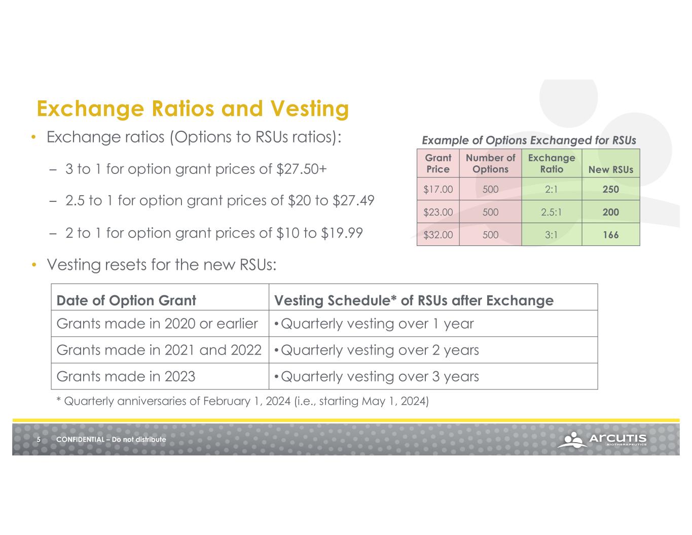 • During the exchange offer period, eligible participants will have the option to exchange eligible stock options for restricted stock units (RSUs) at ratios outlined on the following slide • Eligible options: – Exercise price equal to or greater than $10.00 per share • Eligible employees and consultants: – Must be employed by, or provide services as a consultant to, Arcutis at the beginning and the end of the offering period, and have not submitted a notice of resignation or been notified that your employment is being terminated • Any vested and unvested portions of your eligible options would be subject to the exchange • You can exchange all or none of each eligible option grant (you can’t exchange a portion of your individual grant) • The exchange offer period is expected to commence on Tue, Jan 16, 2024 and expire at 8:59 pm PST on Mon, Feb 12, 2024 • New RSUs will be granted promptly following the end of the exchange offer. 4 CONFIDENTIAL – Do not distribute Overview of Option Exchange Offer