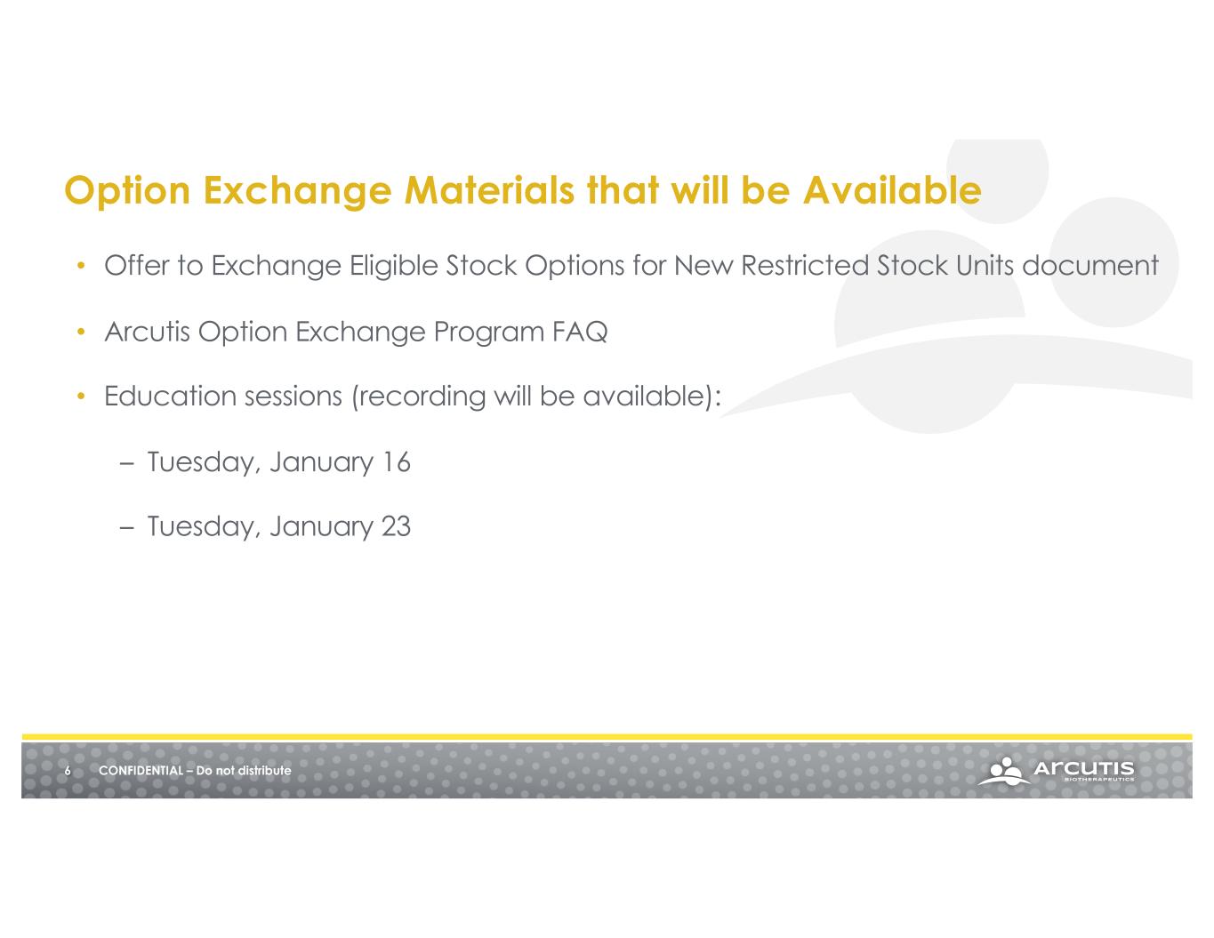 6 CONFIDENTIAL – Do not distribute Option Exchange Materials that will be Available • Offer to Exchange Eligible Stock Options for New Restricted Stock Units document • Arcutis Option Exchange Program FAQ • Education sessions (recording will be available): – Tuesday, January 16 – Tuesday, January 23